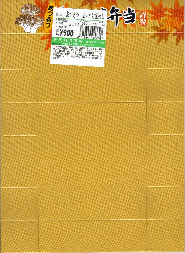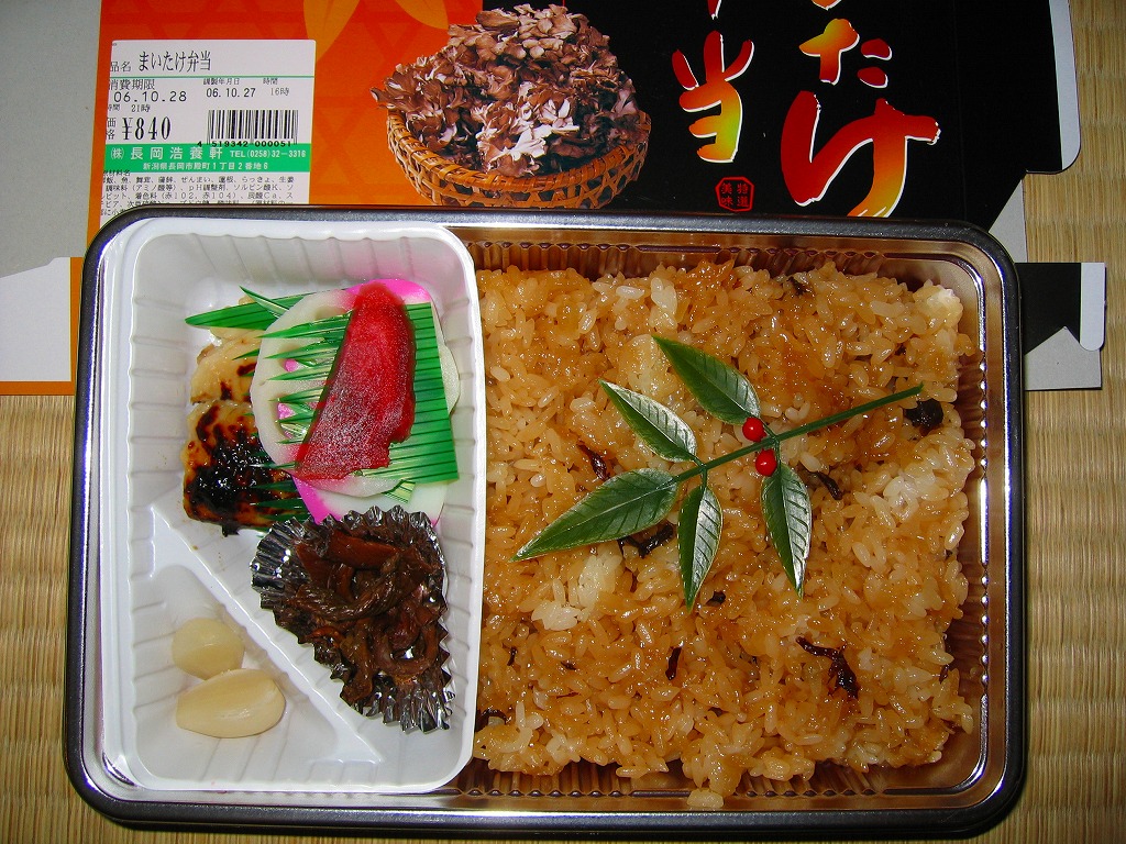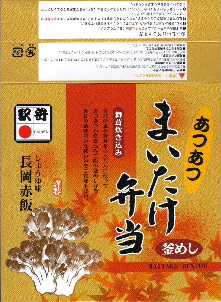 飯はうまいが、見た目はとても貧相。固結した舞茸おこわに混ざる舞茸はごく少量で、白いトレーに載る付け合わせの据わりも素っ気なく、おまけにプラ製なナナカマドの模造葉まで置かれる。こういう国鉄時代の駅弁がよくぞ21世紀に残り、しかも百貨店の駅弁催事に来てくれたもの。客寄せにはならないだろうが、越後から東京近郊のニュータウンへ移住してきた方々に、旅情と郷愁を提供する。この駅弁は、2009年6月の調製元の事業停止により失われた。