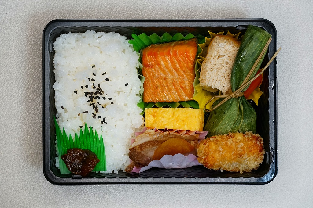 中身はその記載のとおり、鮭の焼漬、だるまれんこん、栃尾油揚げ、神楽南蛮みそ、しょうが醤油チャーシュー、車麩のカツ、笹団子、長岡産コシヒカリ。かつて長岡駅の駅弁にあった料理を含む、長岡の味8品。これが長岡駅の駅弁だという記事はまだ見ていないが、売り場と品揃えと営業時間で従前からの長岡駅弁の購入が困難になった現状、駅のコンビニで買えるうえ、調製元も内容も地元の長岡であるこのお弁当は、今の長岡駅弁といえるだろう。旧長岡市内とその周辺では、仕出し弁当としての注文もできる。