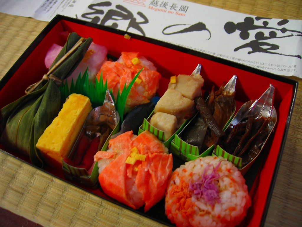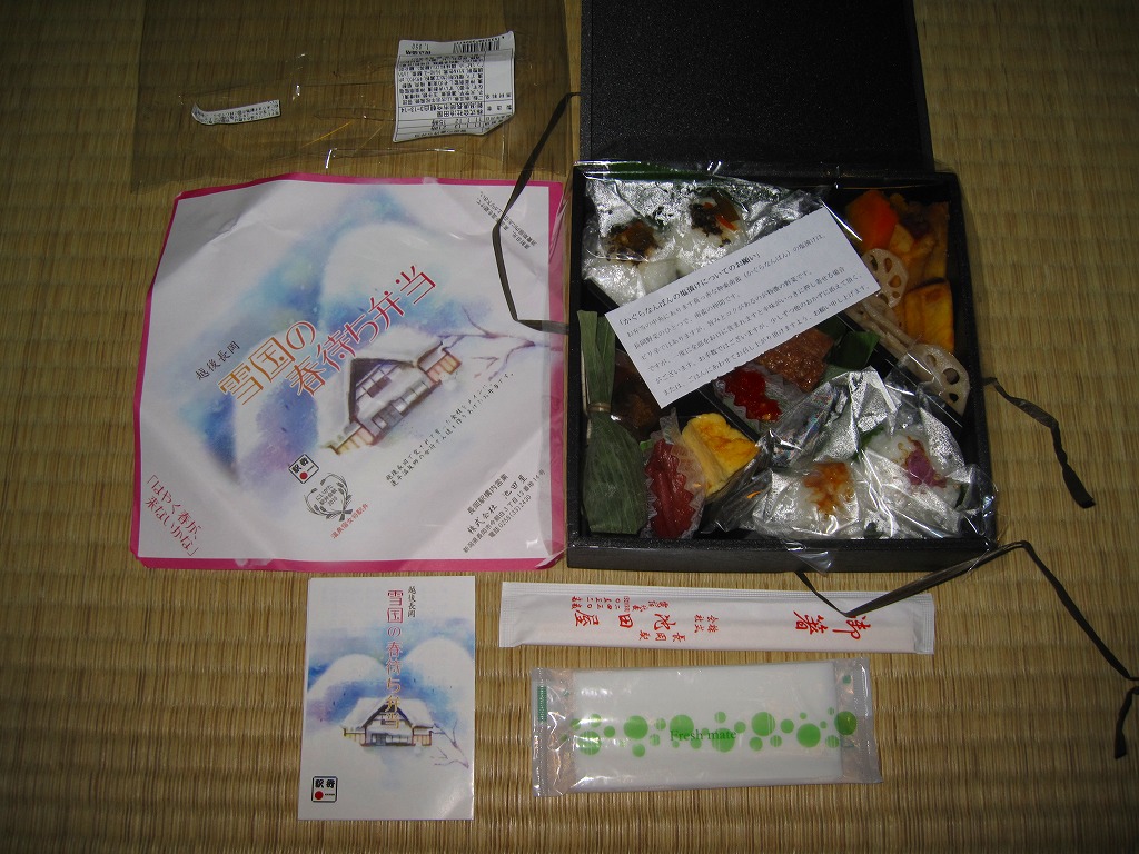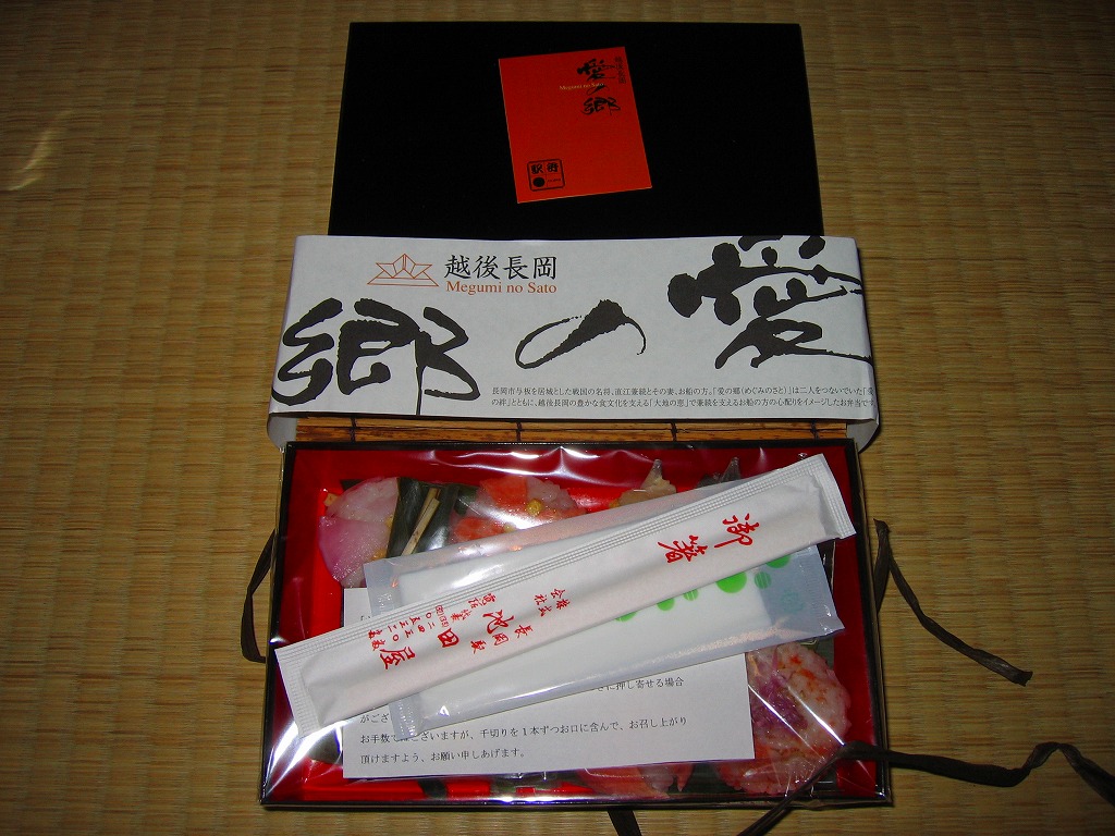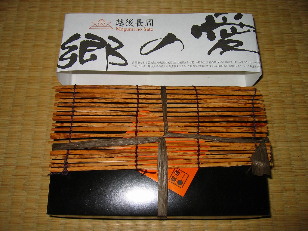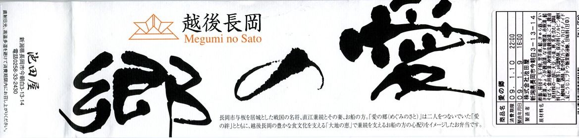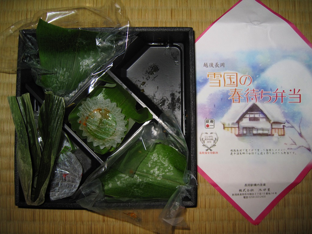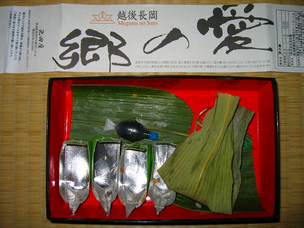 この駅弁は直江兼続をイメージした愛妻弁当だそうで、実は2009年のNHK大河ドラマ「天地人」にちなんでいる。妻の「お船の方」が長岡出身ということで、長岡野菜を多く使ったそうな。見るからに手間をかけて、とても地味に郷土の味が詰まり、そのコストがおそらく価格に反映されてしまっており、来年の今頃に残っているかどうか。あるいは調製元が「限定販売」をうたっており、今シーズン限りの駅弁かもしれない。2011年まで販売された模様。