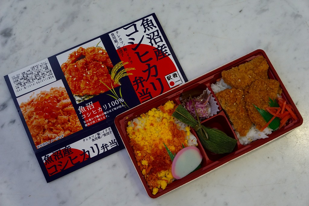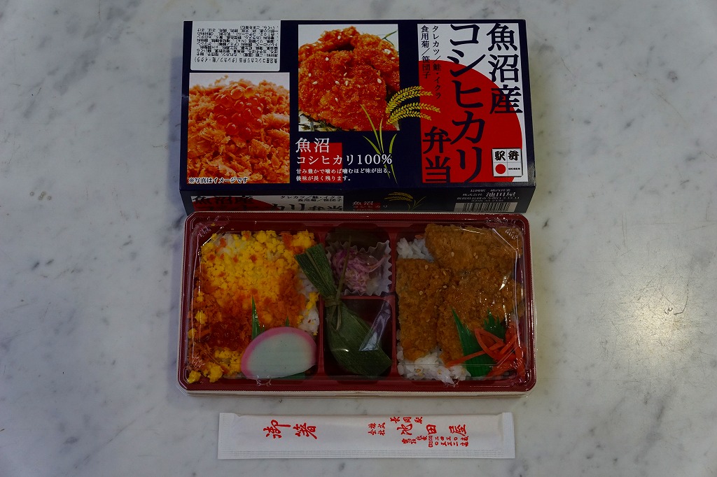 東京駅から新幹線で約1時間半。南魚沼市は新潟県中越地方の南部に位置する、2004年に3町の合併でできた人口約5.4万人の市。東京と新潟を結ぶ鉄道や国道や新幹線や高速道路が市域を縦貫し、多くのスキー場が立地する。駅弁は新幹線が開通し駅が巨大化した1982年に長岡駅の駅弁屋が進出し、2013年3月限りで撤退した。1923(大正12)年9月1日開業、新潟県南魚沼市浦佐。