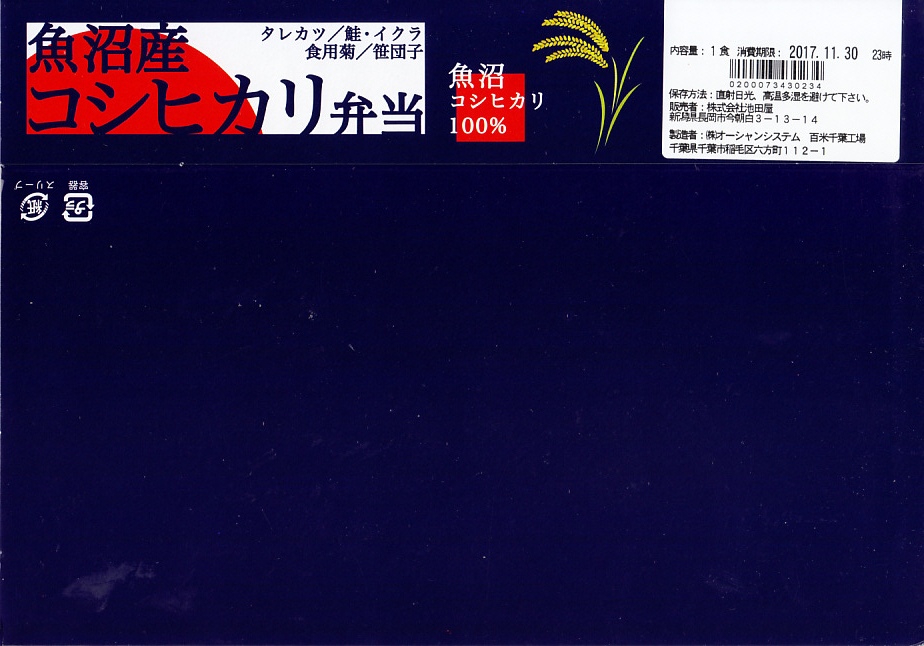 2017(平成29)年11月の発売。「越後長岡海鮮花火」ともども、調製元の創業130周年にちなむ新作らしい。横長の容器の左側で、白飯を玉子そぼろと鮭フレークで覆い、イクラとカマボコを添え、右側で白飯をタレカツで覆い、紅生姜を添え、真ん中に菊花と笹団子を置く。中身はパッケージの見本写真ほど美しくなくも、魚沼産コシヒカリという御飯はクールに香った。調製元の公式サイトでは2023年時点で「お休み中」とのこと。