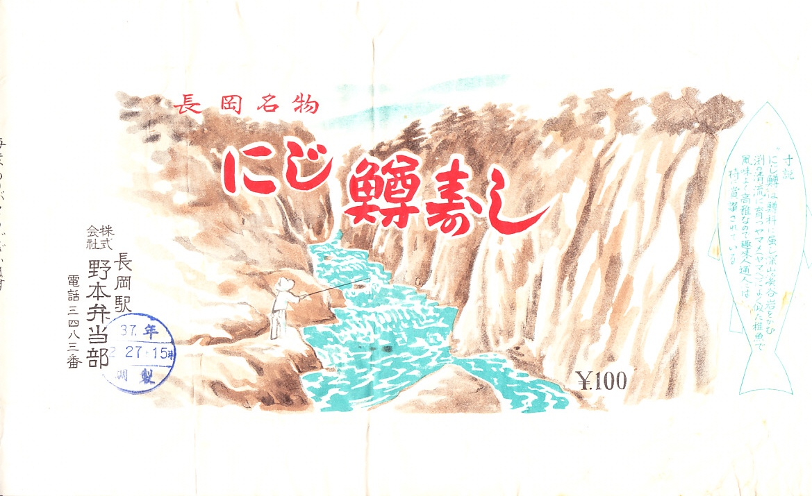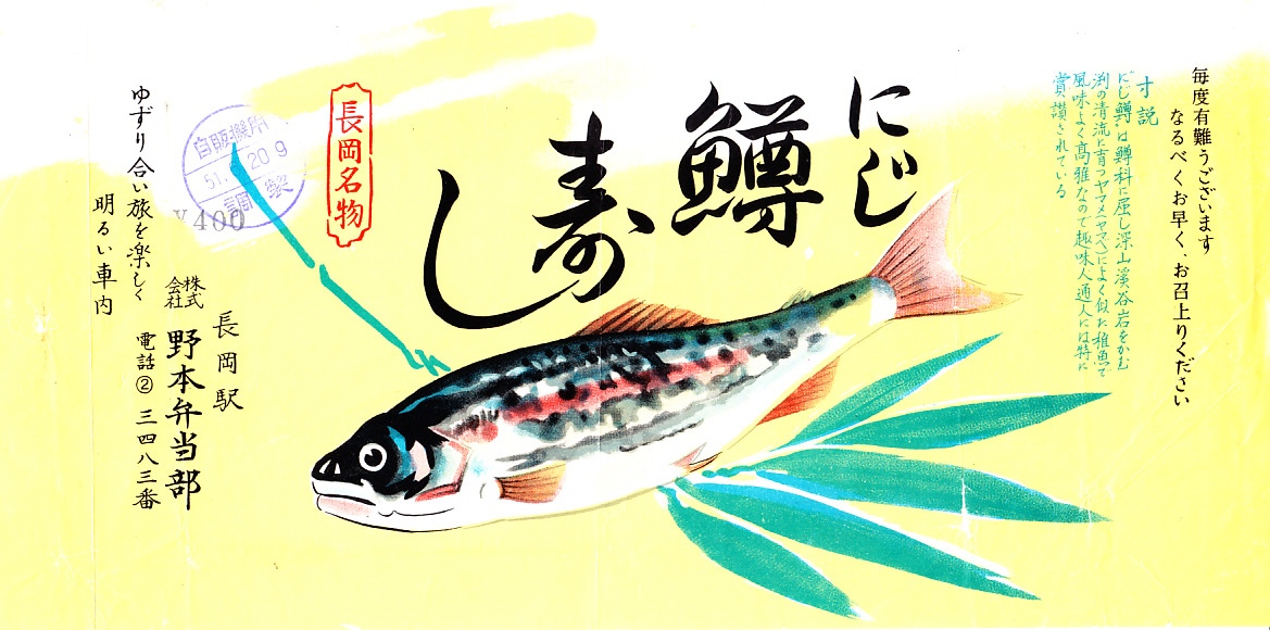 1976(昭和51)年6月20日9時の調製と思われる、昔の長岡駅弁の掛紙。にじ鱒ずしは1960年代や1970年代の長岡駅で売られた駅弁だった。