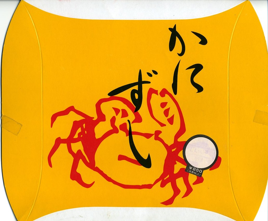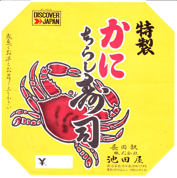 1972(昭和47)年5月22日12時の調製と思われる、昔の長岡駅弁の掛紙。絵柄は2009年まで売られた上記の駅弁「かにずし」と変わらない。