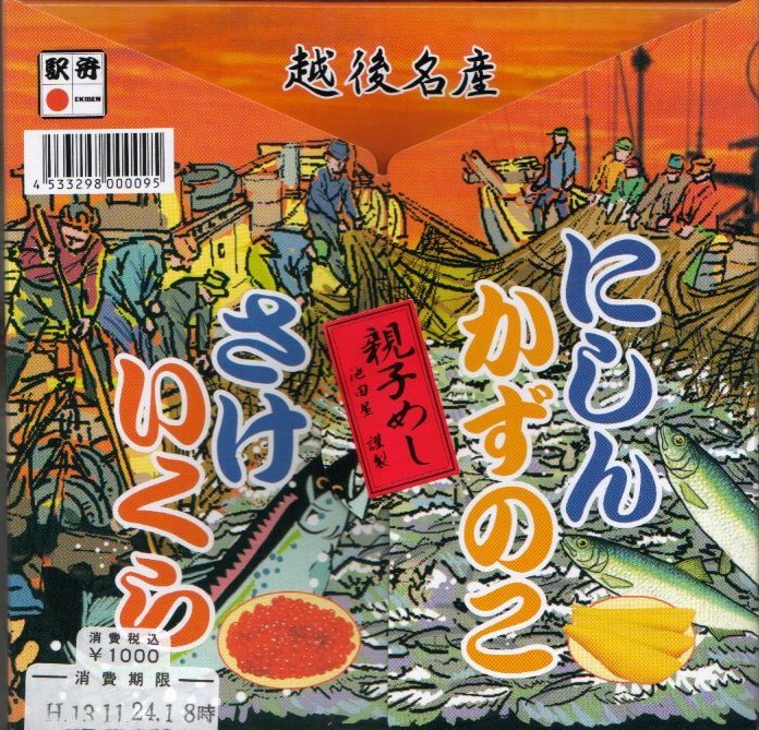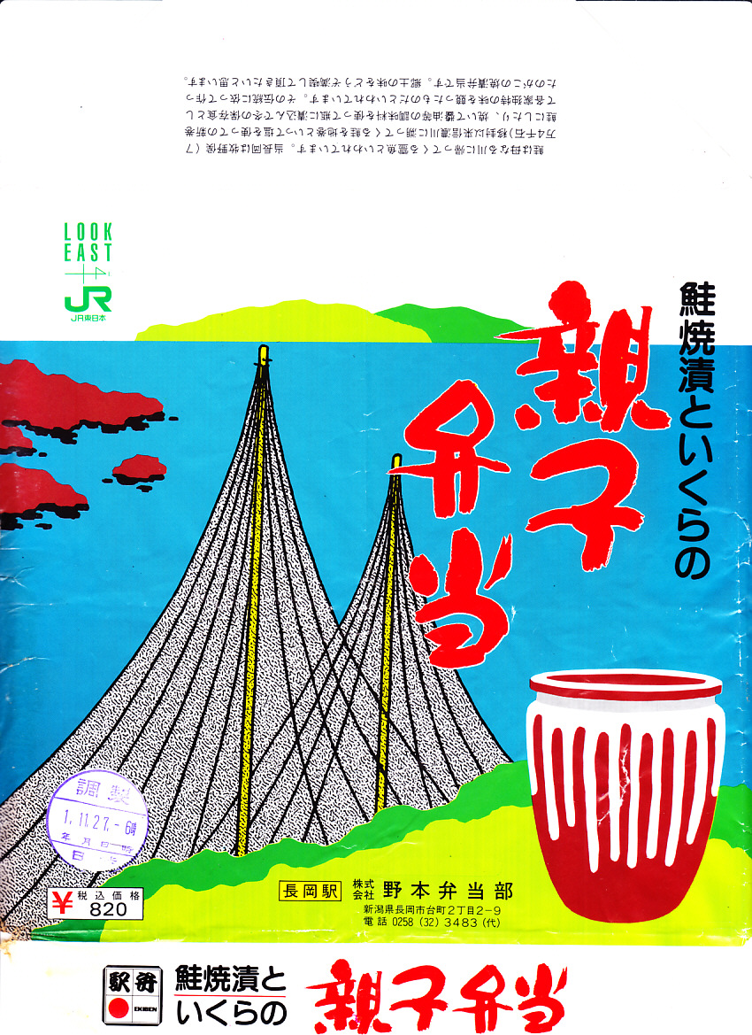 1989(平成元)年11月27日の調製と思われる、昔の長岡駅弁の掛紙。解説により長岡の信濃川に遡ってくる鮭の伝統に依って作った焼漬弁当と読めるが、絵柄は長岡でないと思う海や島や岩礁、日本海と佐渡島と何かに見える。