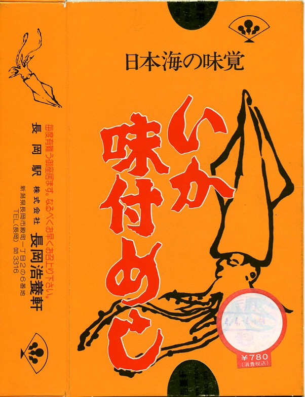 1992(平成4)年4月4日14時の調製と思われる、昔の長岡駅弁のパッケージ。これも現在のものとほぼ同じだが、あまりにもシンプル過ぎる印刷内容なので、食品表示ラベルやキャンペーンシールを貼っているほうが賑やかでいい。