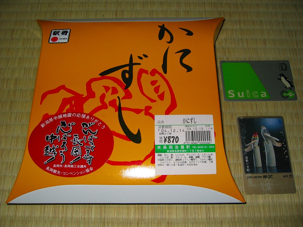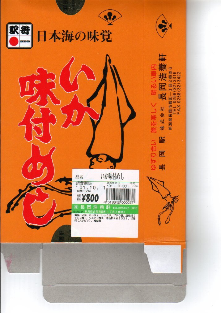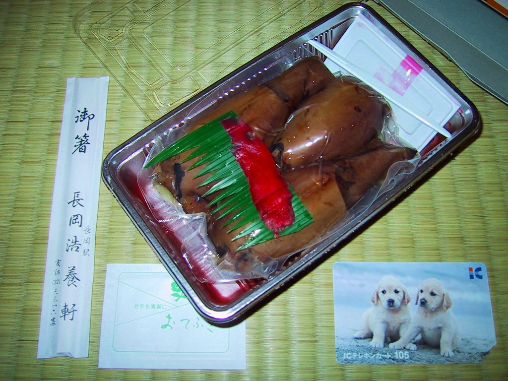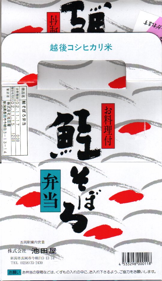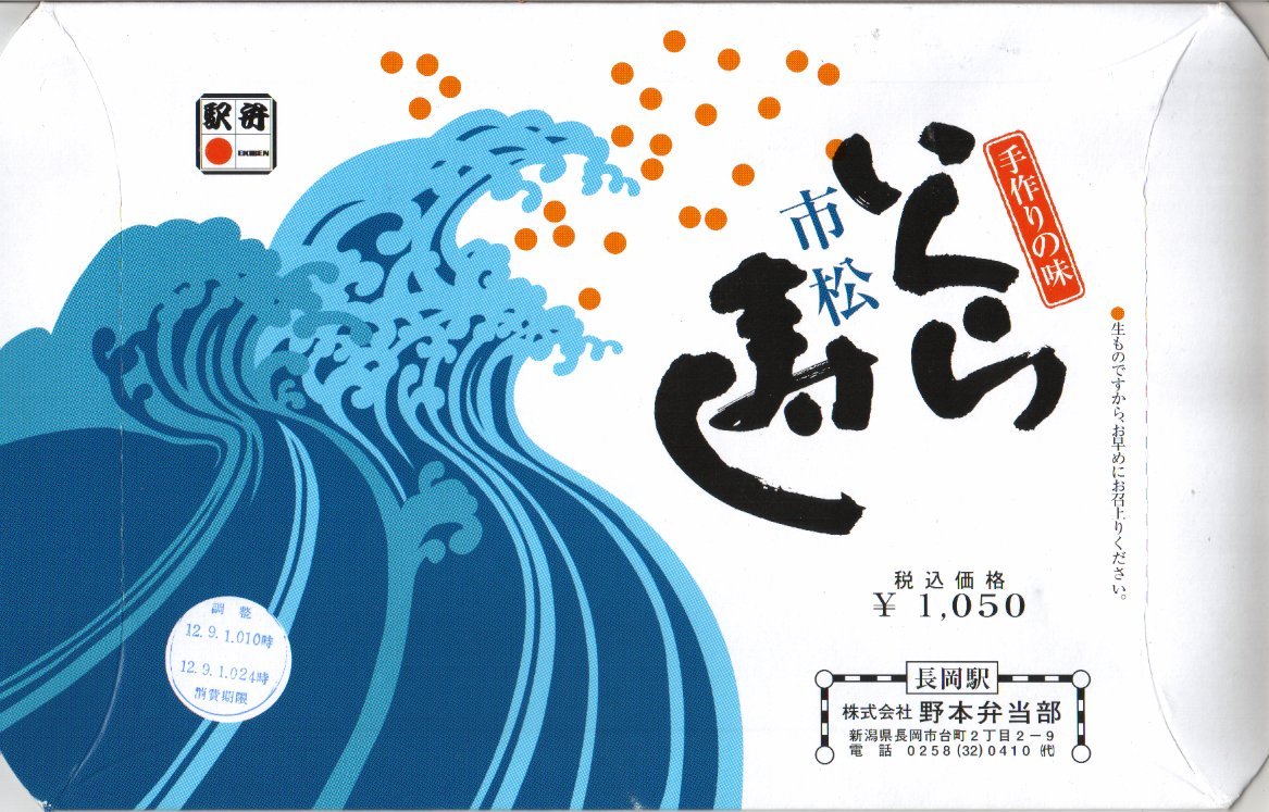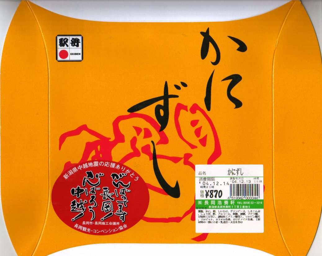 法令の強化で大きくなった食品表示ラベルに負けない巨大さで「がんばろう長岡!がんばろう中越!」のシールが貼られる。2004年10月の新潟県中越地震に伴う連日の地震報道で、観光客など新潟県への訪問者は激減しているそうで、被災地以外では政官財界挙げて宣伝に励んでいる。しかしこの駅弁は、2009年6月の調製元の事業停止により失われた。