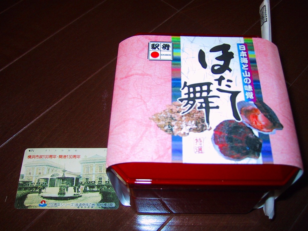 正方形のプラスティック製二段重ね容器を掛紙で留める。中身は、下段がホタテの干し貝柱を新潟米コシヒカリと一緒に炊いた醤油味の炊き込み御飯、上段はおかずで煮ホタテの他にまいたけ・ふき・竹の子・ごぼうなどが入る。どこから食べても美味い駅弁で、これが千円以下で買えるのは駅弁としてはかなりお得だ。しかしこの駅弁は、2009年6月の調製元の事業停止により失われた。