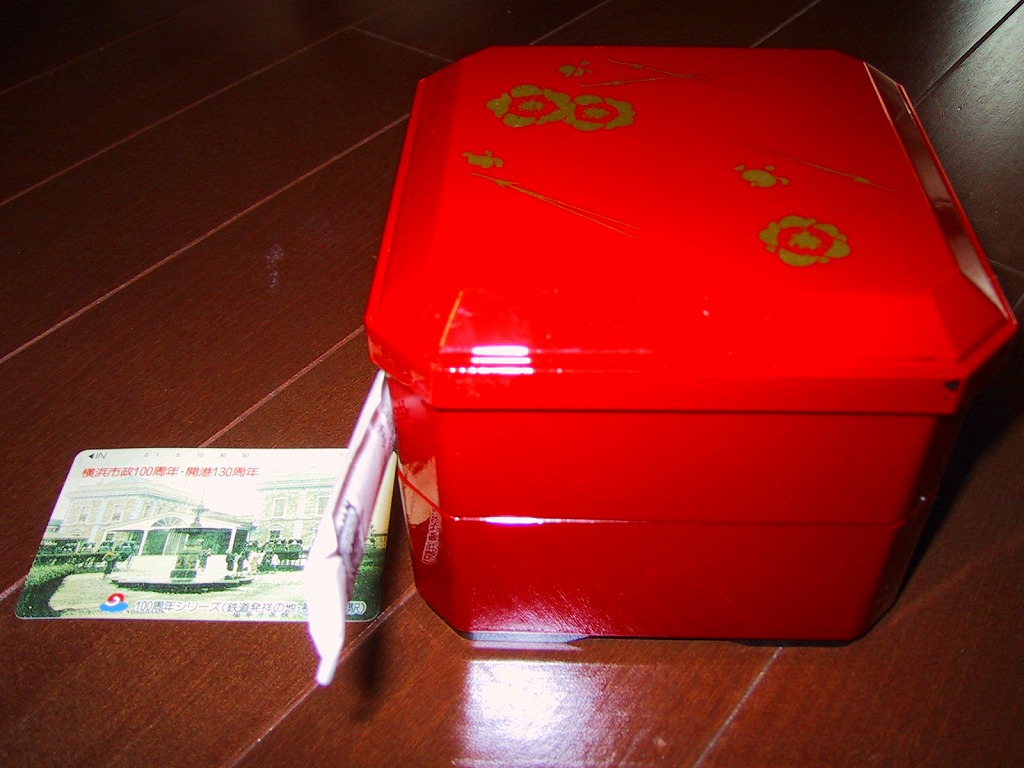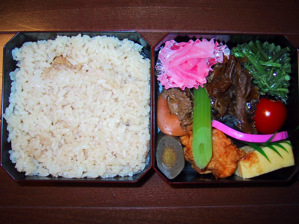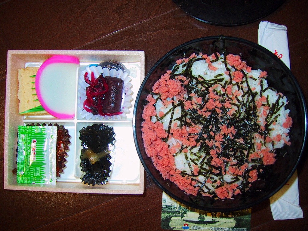 1983(昭和58)年に発売。コシヒカリの鮭そぼろめしが入った丸い容器と、佃煮・奈良漬け・昆布巻きなどの付合せが入った正方形の容器の、駅弁では珍しい異型容器の二段重ね。お茶を別途購入することで鮭茶漬けができるアイデアが面白いが、それが外観のインパクトに結び付いていないため、写真のように駅弁大会で最後まで売れ残っていたりするのはもったいない。価格は2002年の購入時で840円、2015年時点で890円。調製元のツイッターによると、2015年11月15日限りで終売。