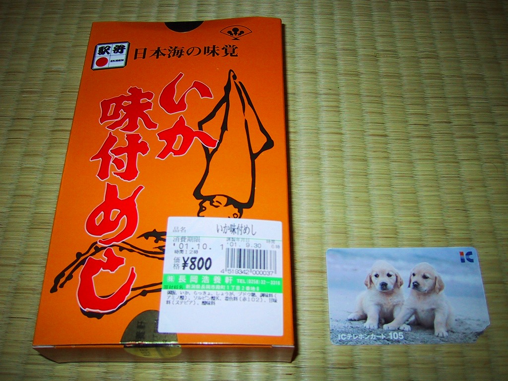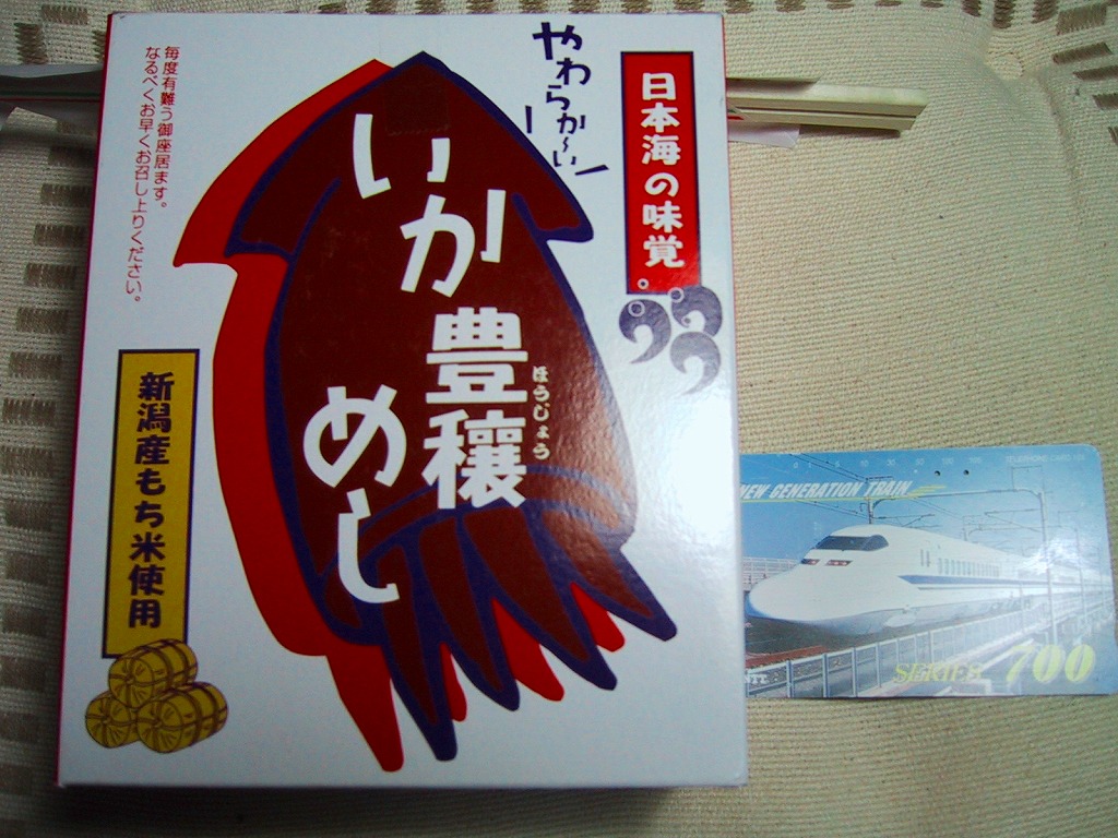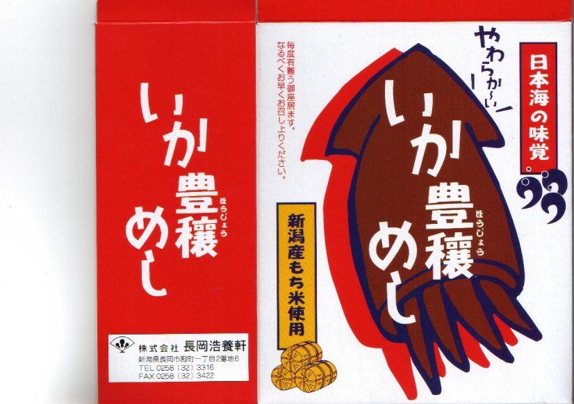 小ぶりのボール紙製パッケージに、佐渡のイカと新潟の餅米を使ったいかめしをふたつ入れた真空パックがそのまま入る。ナイフと割り箸付き。味は北海道内の観光売店でよく見かける真空パックのいかめしよりやや勝り、同じ駅弁屋さんの類似商品とは雲泥の差。常温で2週間も日持ちがするので、売り手も買い手も便利な製品だろう。磐越西線の観光列車「SLばんえつ物語」の車内でも販売された。しかしこの駅弁は、2009年6月の調製元の事業停止により失われた。
