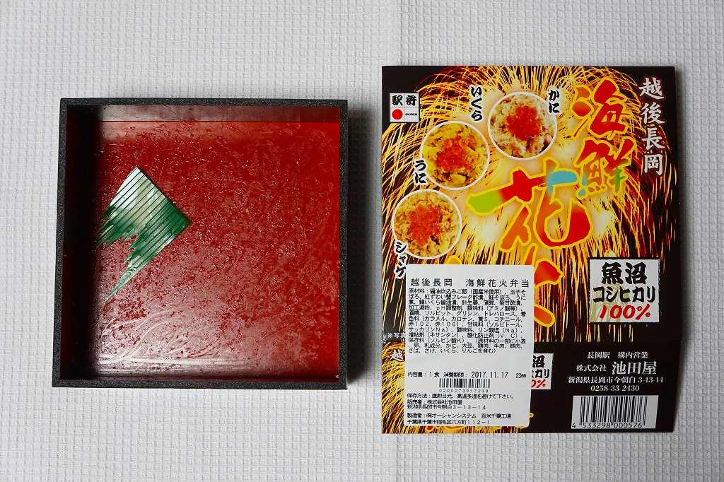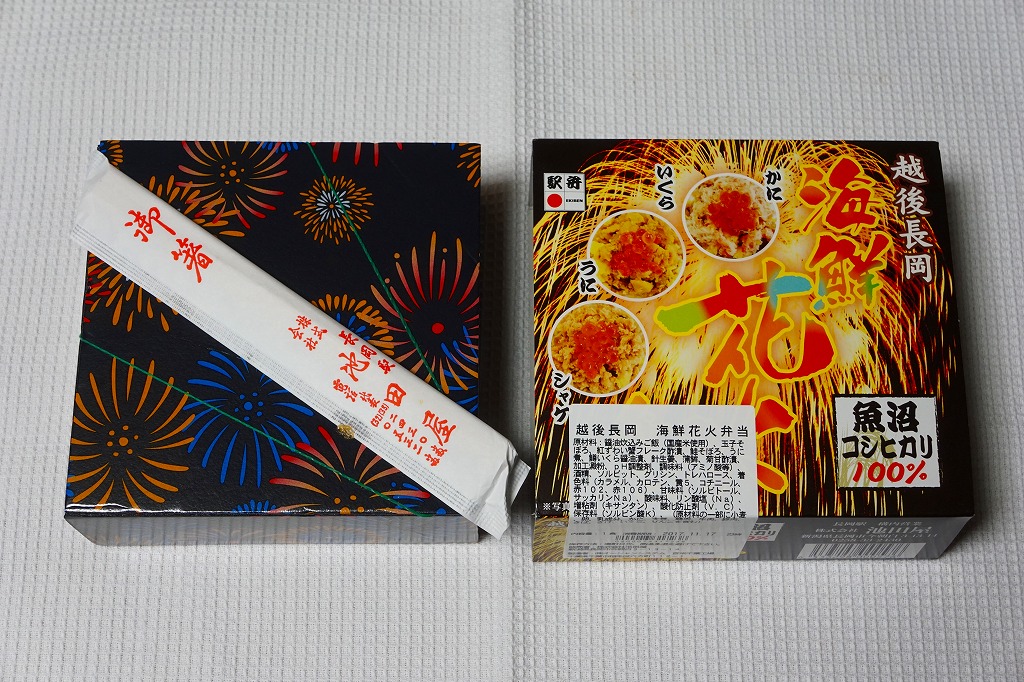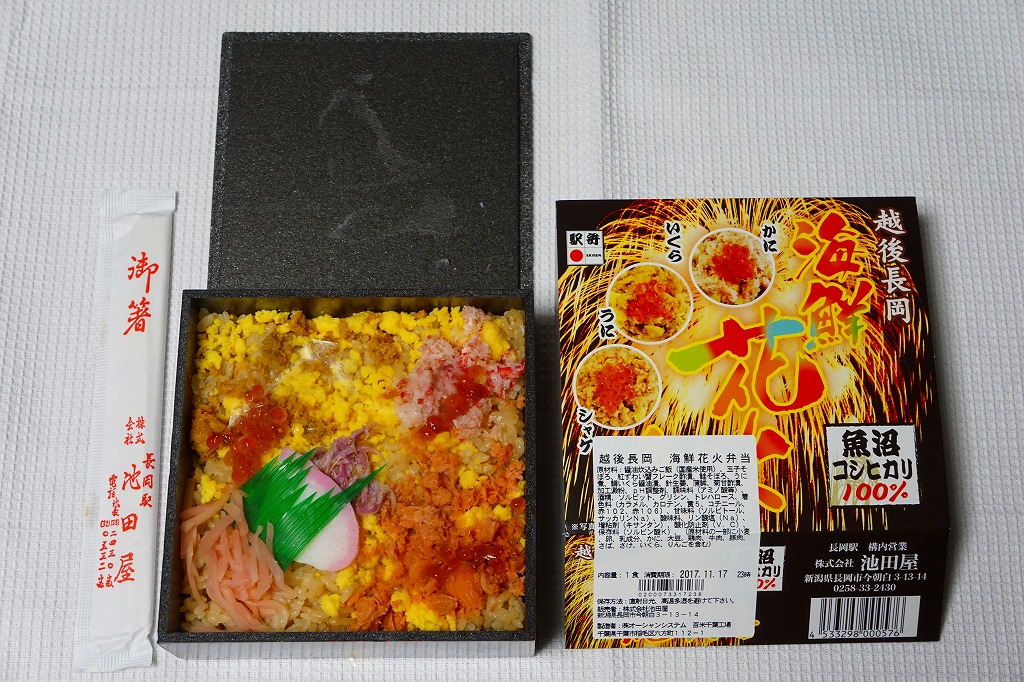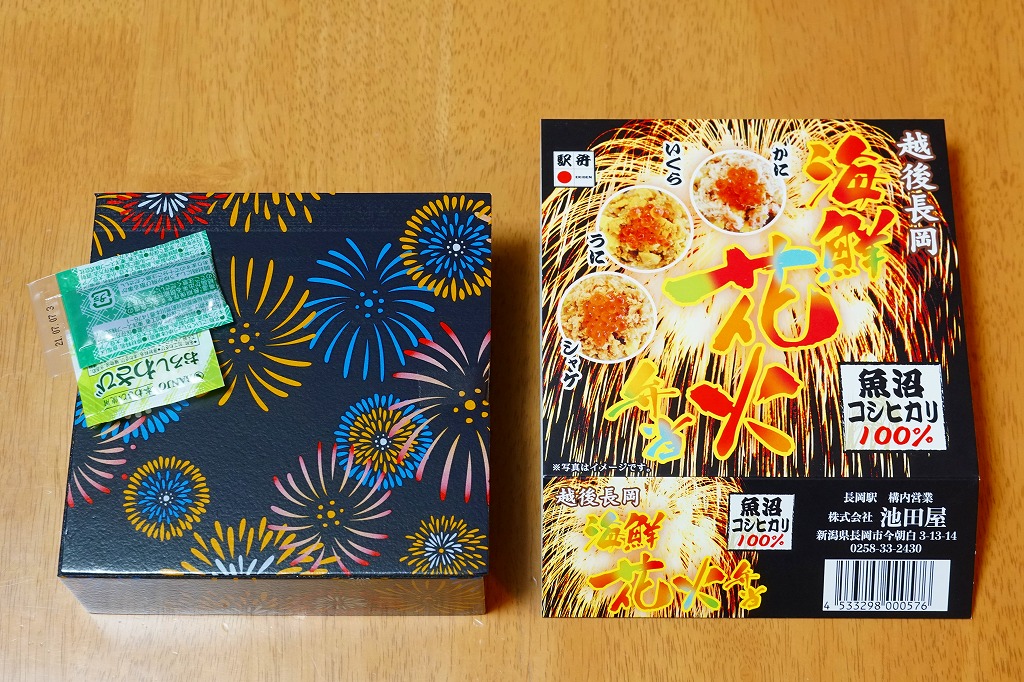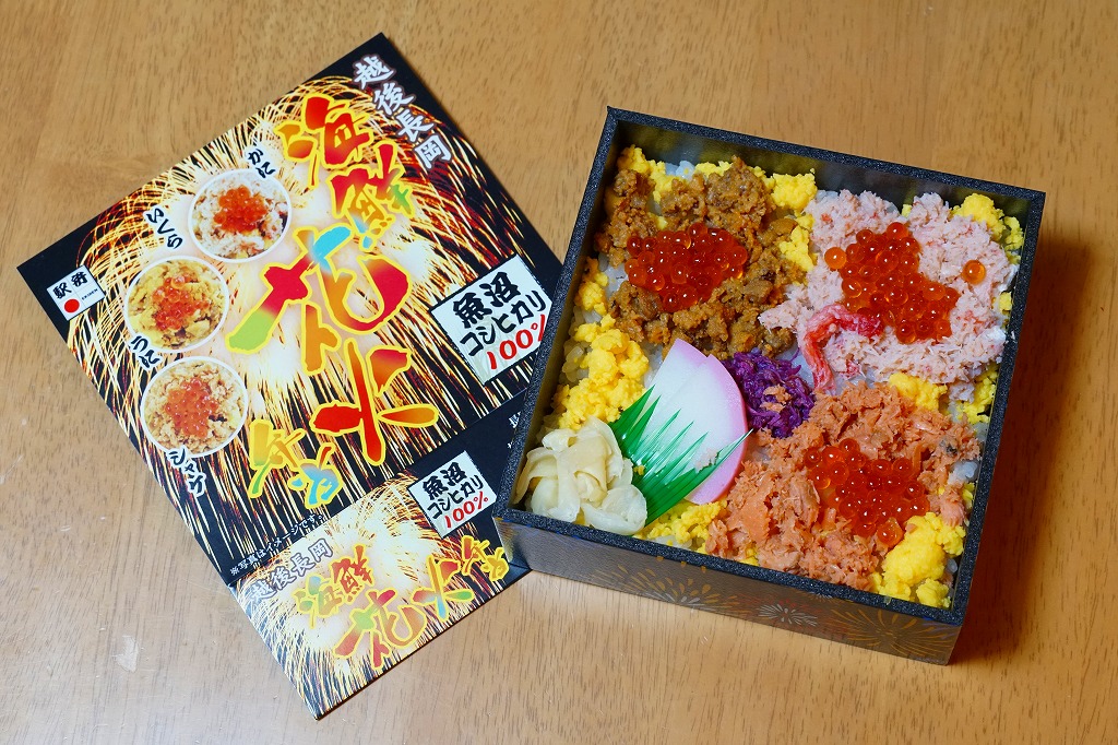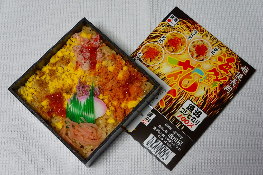 上記の駅弁「越後長岡海鮮花火」を、2021(令和3)年1月の京王百貨店の駅弁大会で購入したもの。発売からリニューアルなどを経ていないため、以前とすべてが同じつくり。カニとウニが多い気がする。法令の強化で巨大化した食品表示ラベルが、店内調製により調製印だけで済んだため、スリーブに描かれる長岡花火が、その姿を隠さずに現していた。