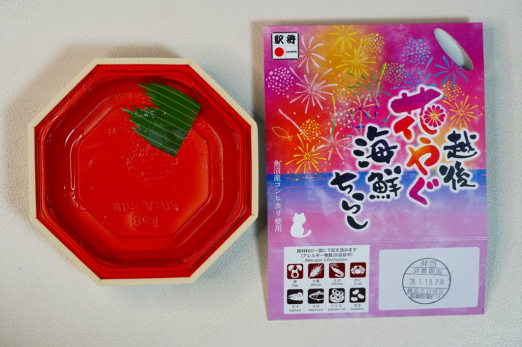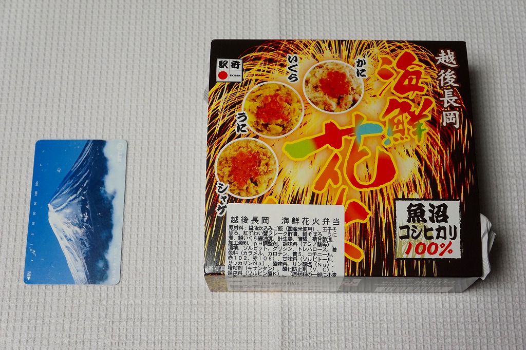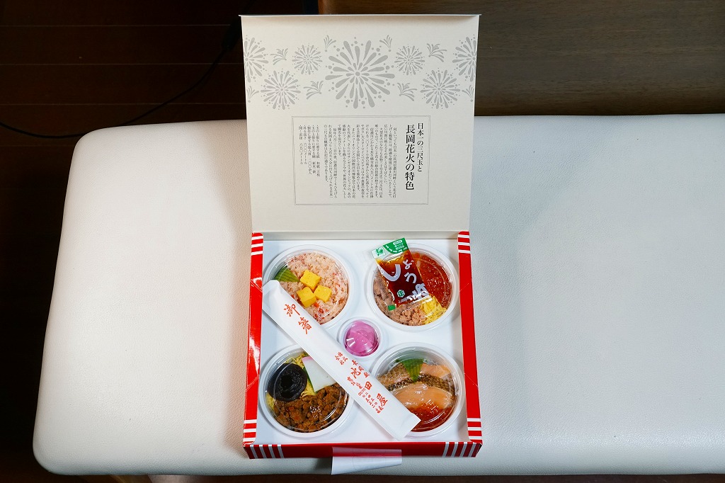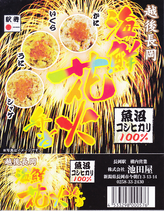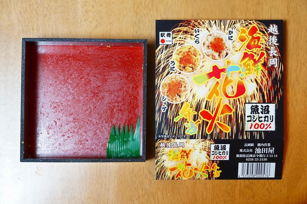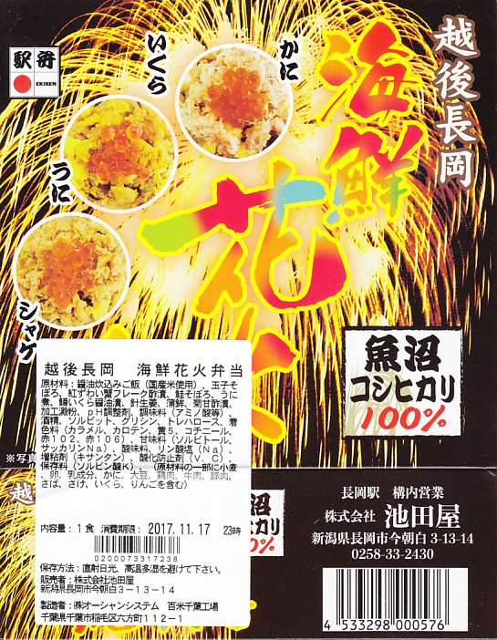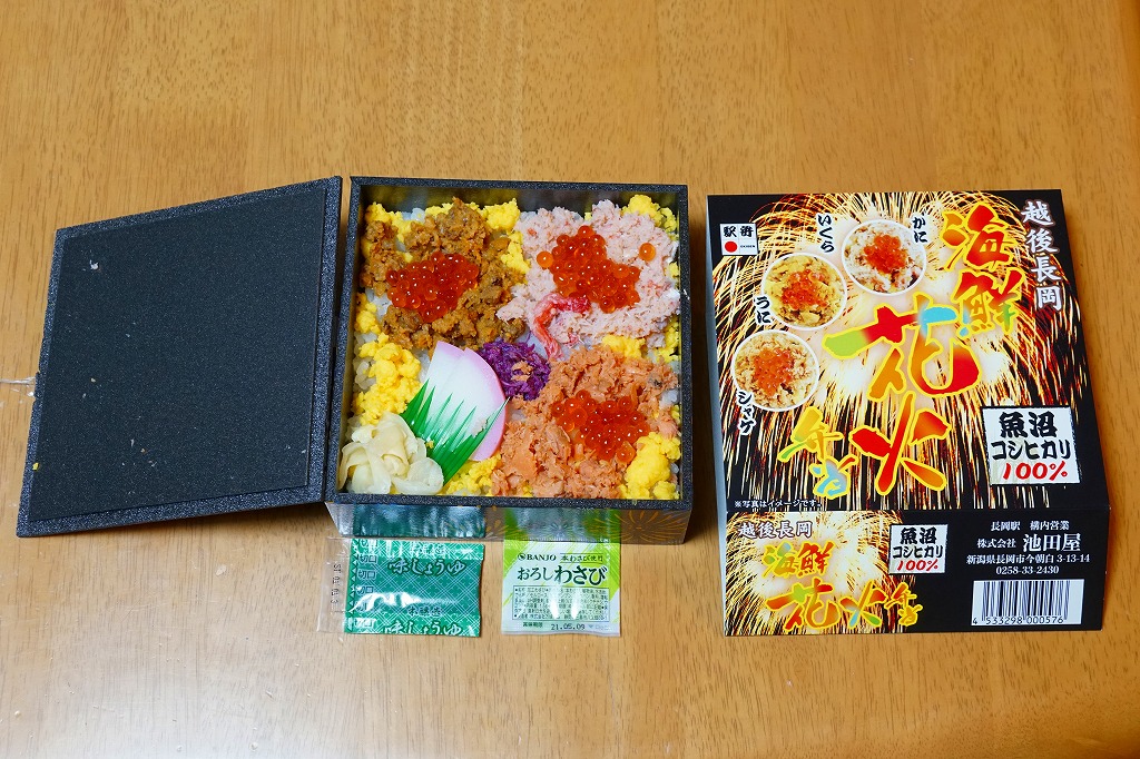 上記の駅弁「越後長岡海鮮花火」を、2021(令和3)年1月の京王百貨店の駅弁大会で購入したもの。発売からリニューアルなどを経ていないため、以前とすべてが同じつくり。カニとウニが多い気がする。法令の強化で巨大化した食品表示ラベルが、店内調製により調製印だけで済んだため、スリーブに描かれる長岡花火が、その姿を隠さずに現していた。
