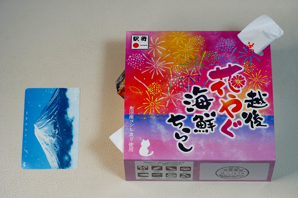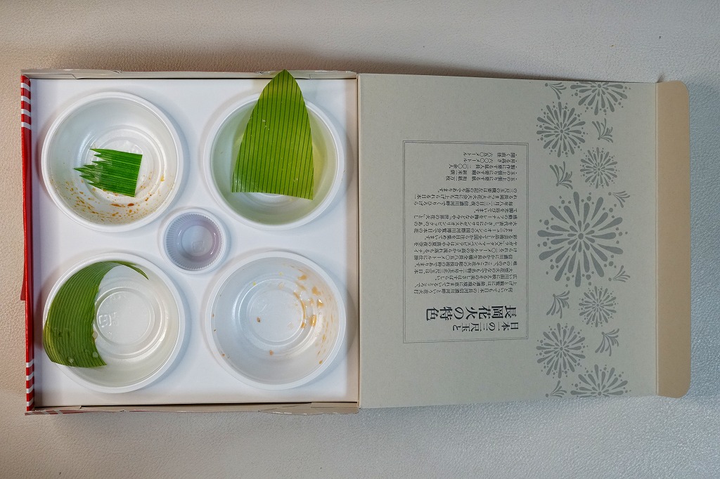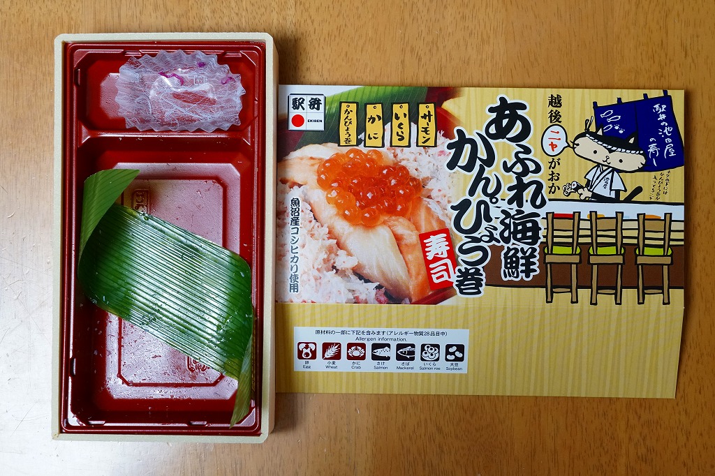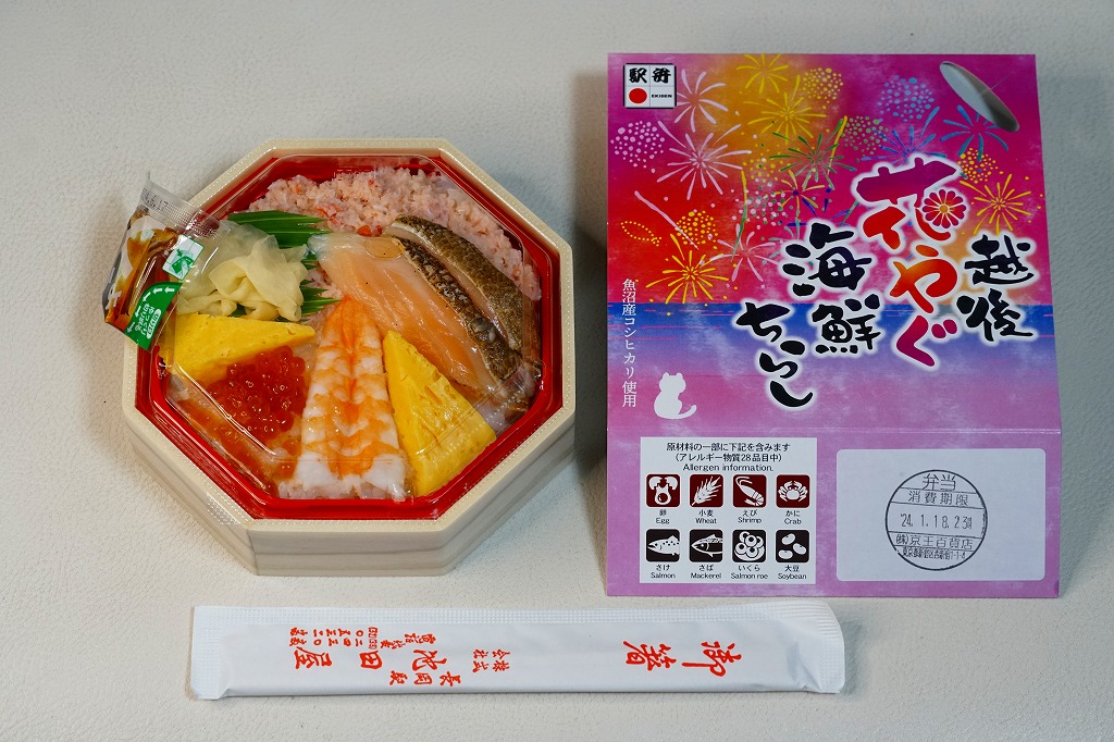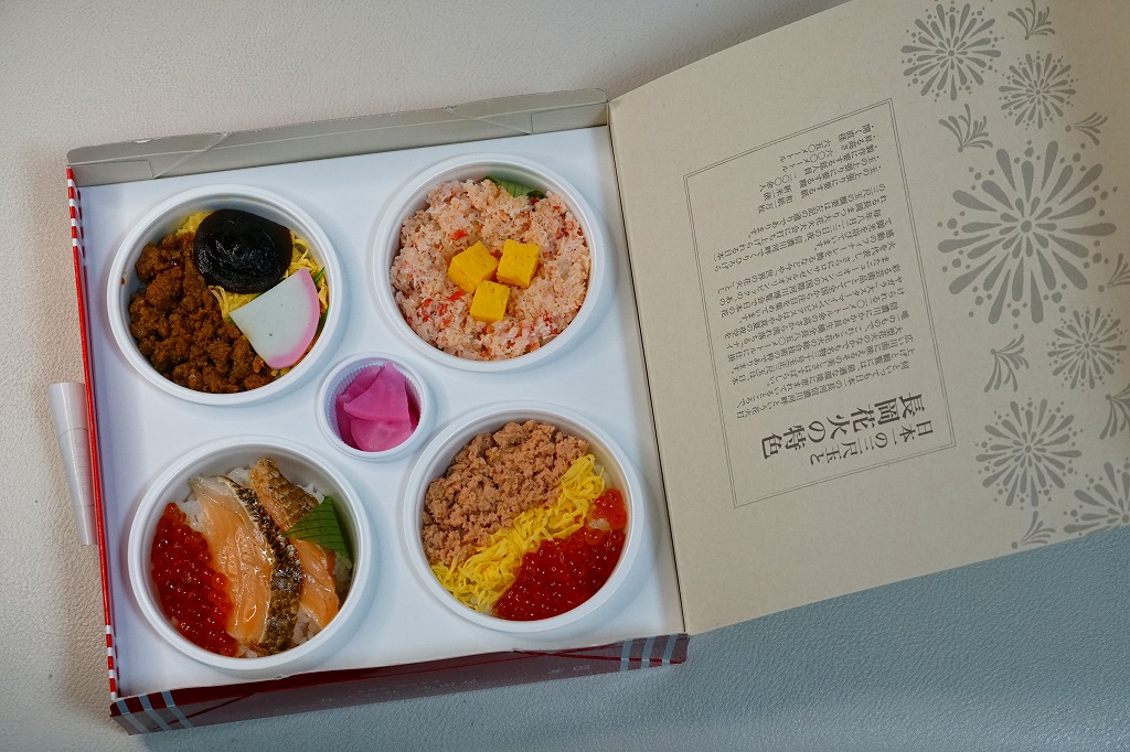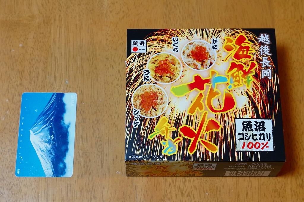 上記の駅弁「越後長岡海鮮花火」を、2021(令和3)年1月の京王百貨店の駅弁大会で購入したもの。発売からリニューアルなどを経ていないため、以前とすべてが同じつくり。カニとウニが多い気がする。法令の強化で巨大化した食品表示ラベルが、店内調製により調製印だけで済んだため、スリーブに描かれる長岡花火が、その姿を隠さずに現していた。