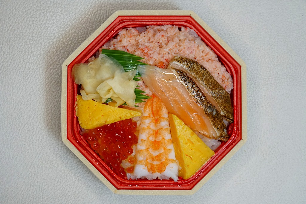 正八角形のプラ容器に酢飯を詰め、えび、さけ、いくら、かに、玉子焼、ガリを放射状に並べる。普通の海鮮弁当に見えたり、花火が開いたように思えたり。調製元公式サイトの商品紹介によると、発売時あるいは現地での予約販売では、えび、ほたて、さけ、いくら、かにのサイコロを散らし、中身の色彩も華やかにみえる。価格は2021年の発売時で1,080円、2024年時点で1,280円。