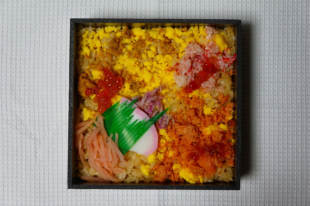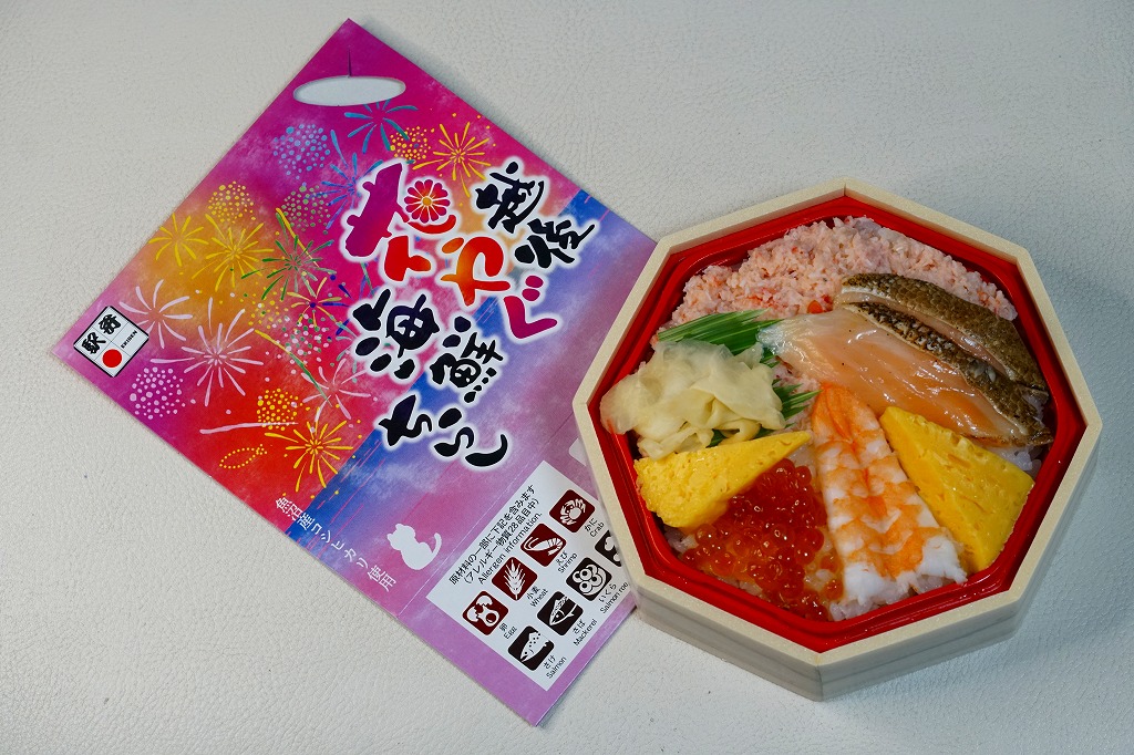 2017(平成29)年11月の発売。「魚沼産コシヒカリ弁当」ともども、調製元の創業130周年にちなむ新作らしい。真っ黒な正方形の容器に新潟コシヒカリの茶飯を敷き、玉子そぼろ、鮭フレーク、カニ、イクラ、蒸しウニ、菊花、かまぼこ、紅生姜で覆う。今回は東京駅で買ったら、「製造者:(株)オーシャンシステム 百米千葉工場」とありびっくり。この売店では仙台駅や米沢駅や新潟駅の駅弁が届くのに、これより東京に近い長岡駅の駅弁が製造委託とは不思議に感じた。2021年時点で販売休止、2022年までの設定か。