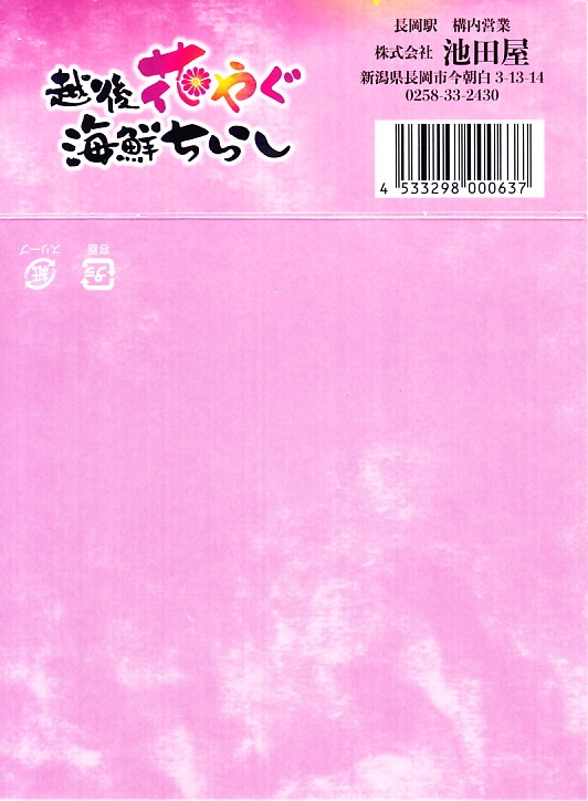 2021(令和3)年1月にネコシリーズの駅弁として、「お魚いなり」(980円)「あふれ海鮮かんぴょう巻寿司」(1,180円)「越後花やぐ海鮮ちらし」(1,080円)の3種類を発売か。スリーブに顔が扁平なネコのキャラクターを載せた他の2作と異なり、こちらのネコは小さなシルエットがあるだけ。海と花火を描いたようなイラストの絵柄と色彩が印象的。