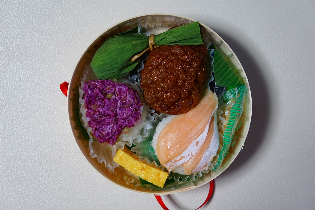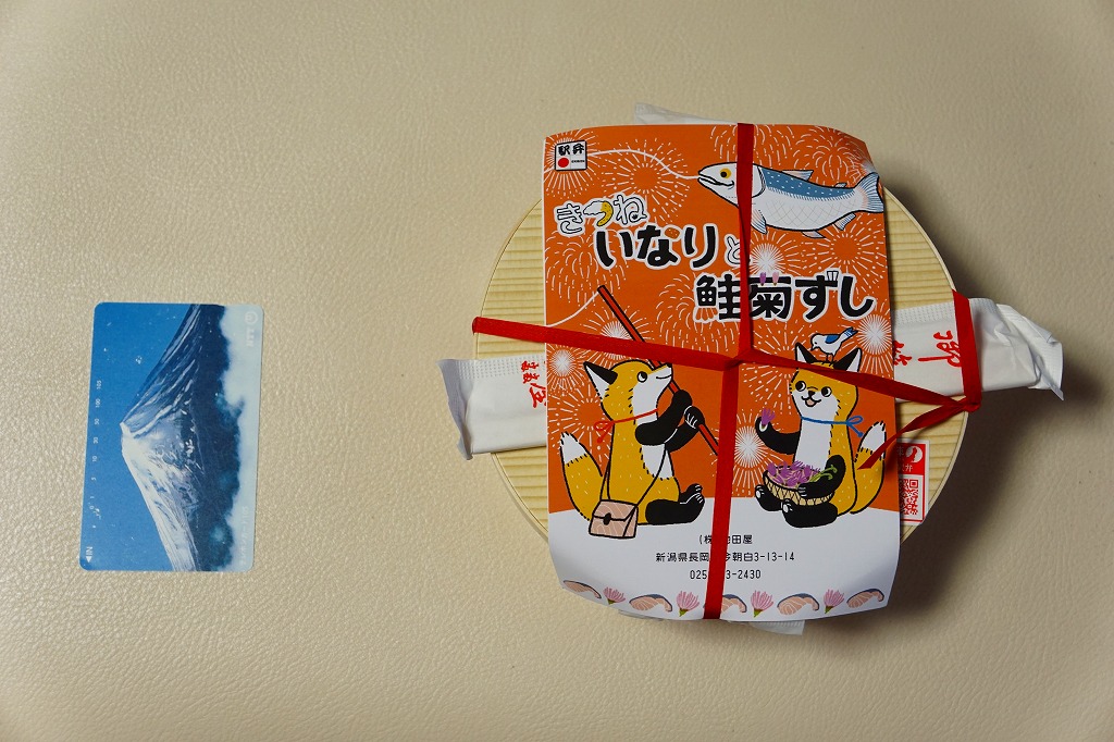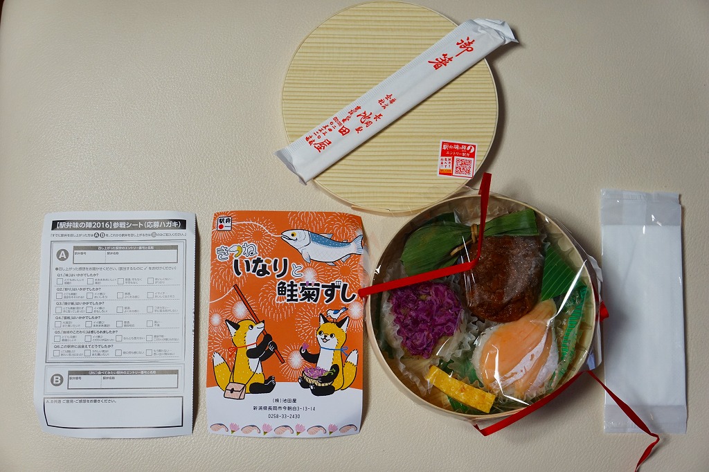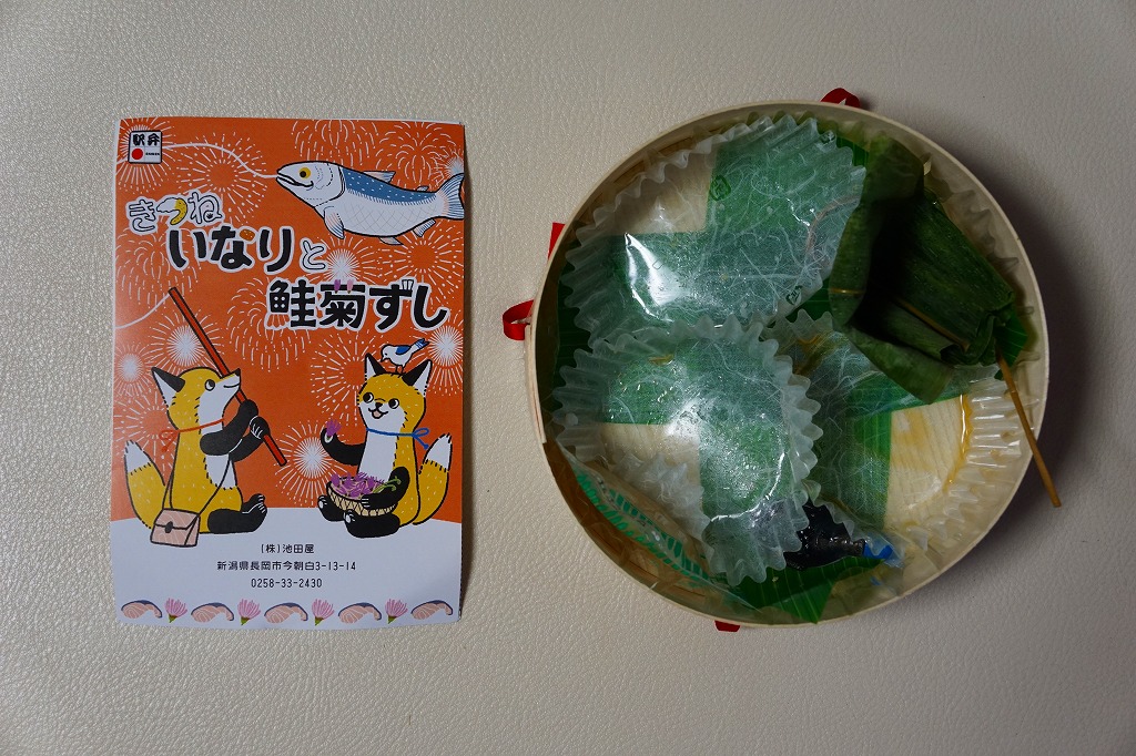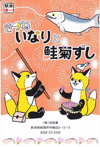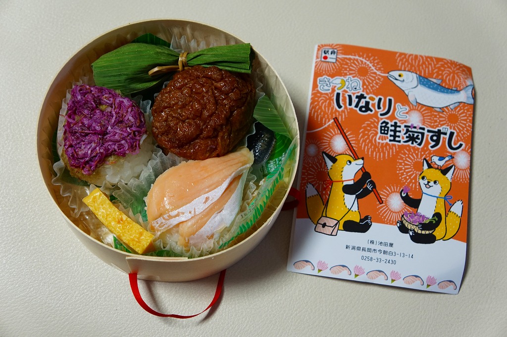 円形の容器に、一口には大きく、割るには小さな、丸く色濃く大きなおいなりさん、鮭を2枚貼った手まりずし、紫色の菊花を載せた手まりずしを詰め、笹団子、玉子焼、ガリの袋、魚型の醤油入れを添える。新潟県には、葉書を掛紙とする駅弁が多い気がする。価格は発売時や2016年の購入時で1,050円、2020年時点で1,150円。調製元の公式サイトでは2023年時点で「お休み中」とのこと。