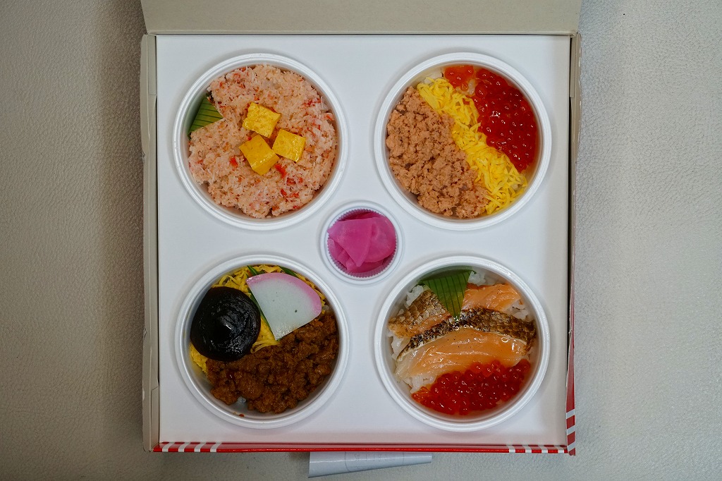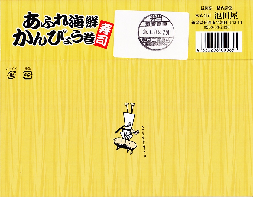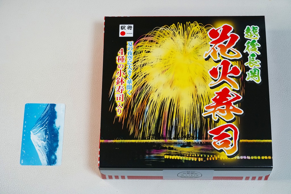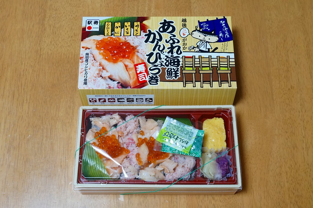 2021(令和3)年1月の京王百貨店の駅弁大会で発売。容器の御飯のパートに、かんぴょうの細巻き8個を敷き詰めて、これらをまとめてサーモンのぶつ切りとカニのほぐし身で交互に覆い、イクラで彩り、玉子焼と食用菊とガリを添える。御飯を巻きずしにして具で覆う、斬新な構造。スリーブで長岡をニャがおかと呼ぶネコを含め、催事場では気が付かれずに客を呼べていなかったが、おいしくて楽しい駅弁なので、情報を整理すればいつか東京で花開くかもしれない。調製元の公式サイトでは2023年時点で「お休み中」とのこと。