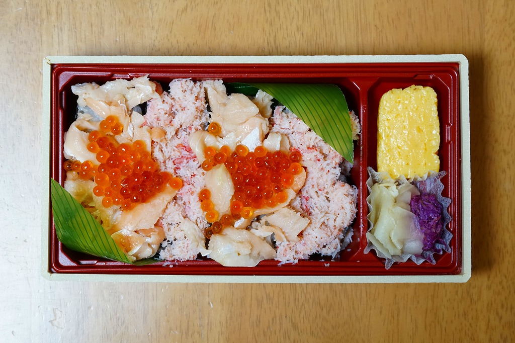 駅弁に使われるとぐっと安っぽく見える白い使い捨て容器を、駅弁のように紙ひもでしばり、立派で駅弁らしいボール紙のパッケージに入れる。中身は酢飯にかにほぐし身とかに爪を載せる、駅弁の名前と一致した内容で、酸味が勝るのも駅弁らしい。一部例外はあるが、カニと関係の薄い地でのカニ駅弁は多くがこんな感じ。でも発売中止にならないくらいは売れているのだろう。
