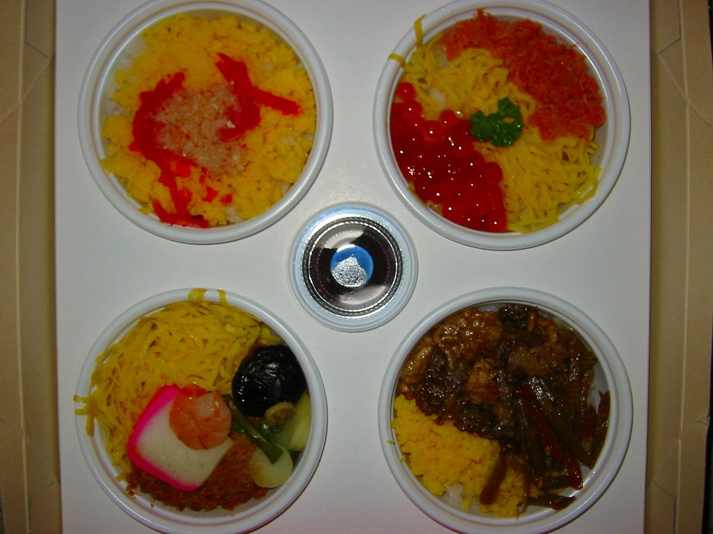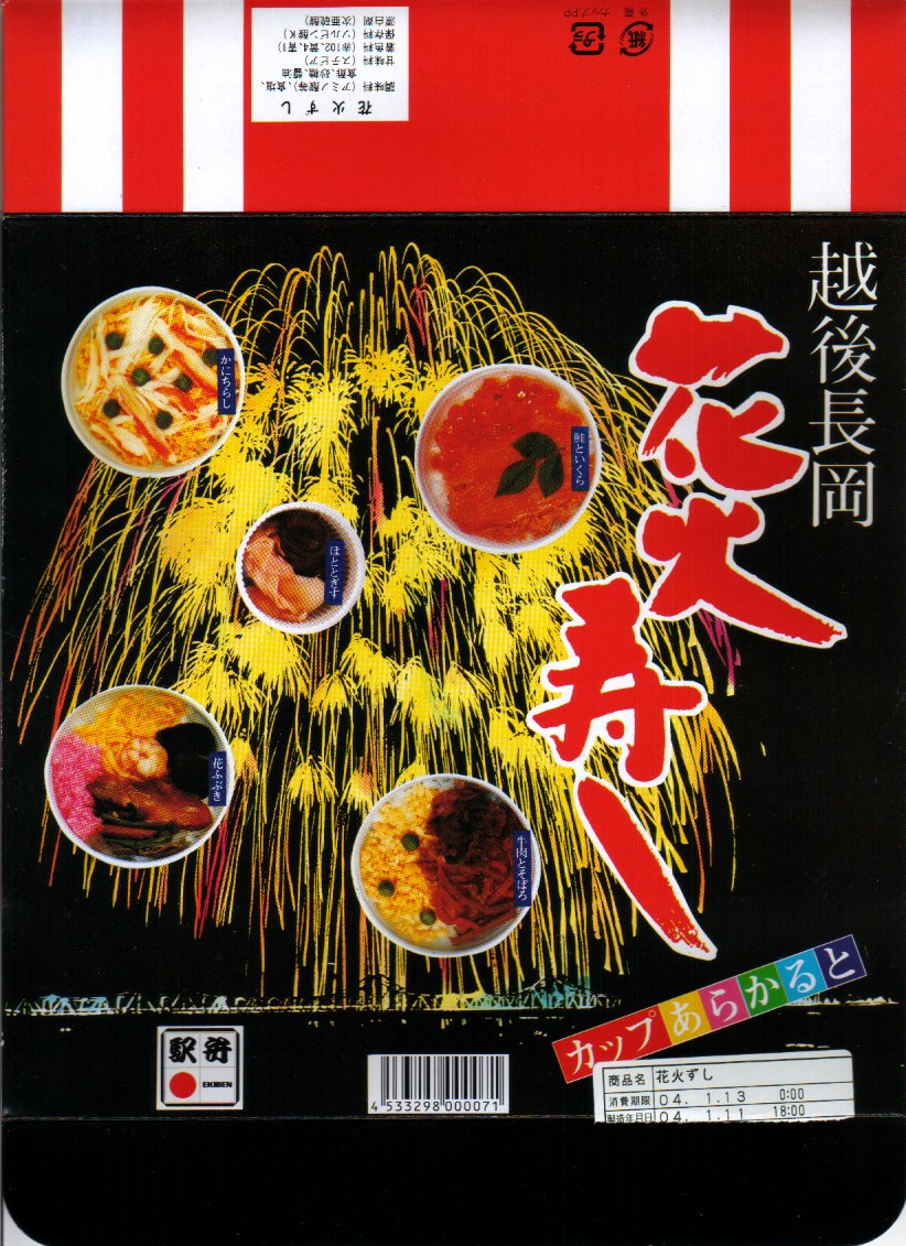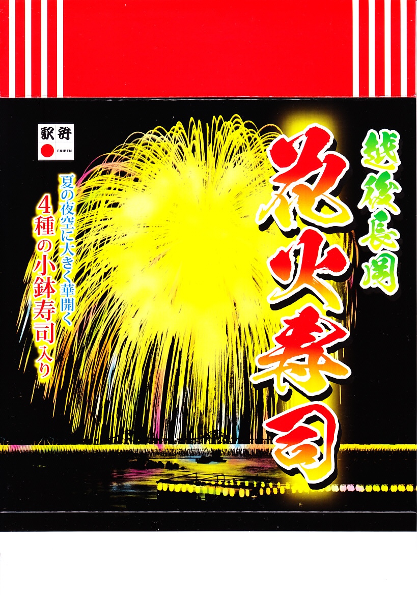 2004(平成16)年1月12日に購入した、長岡駅弁の箱。上記の2024年のものと、だいたい同じ。当時は中身の写真もふたに載せたほか、駅弁の名前が「花火寿司」でなく「花火寿し」であった。当時のカップの中身は、カニちらし、鮭いくらめし、牛肉とそぼろの御飯、エビや蒲鉾などの御飯。