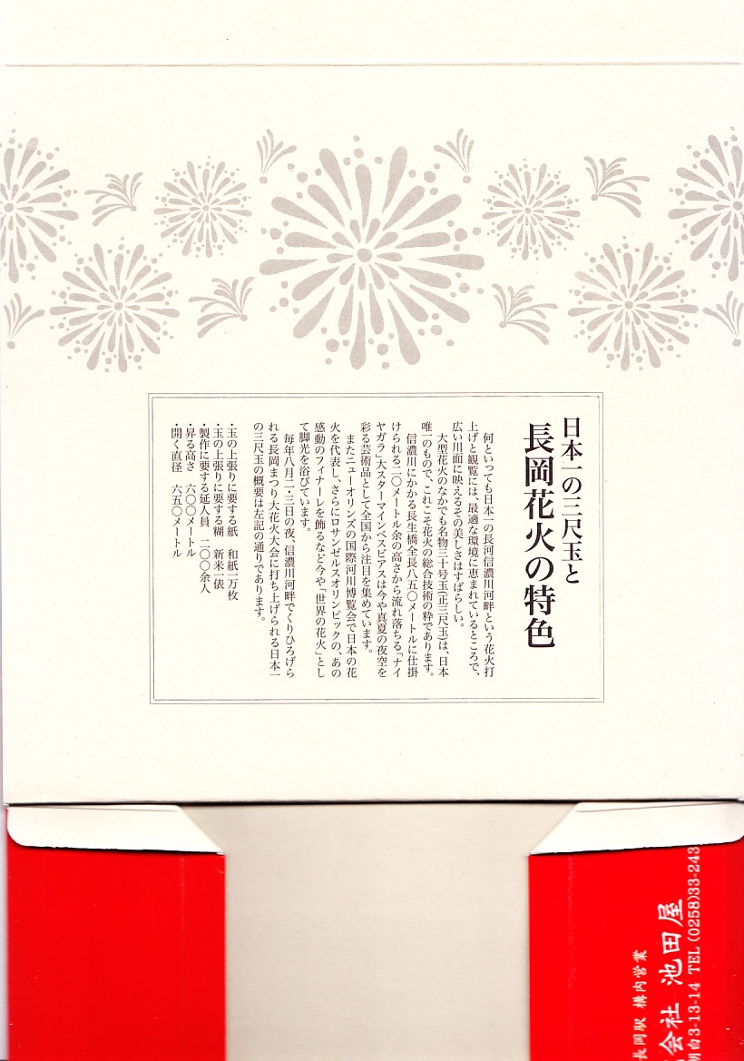 長岡の花火は明治に興り大正に巨大化、戦前に一旦途絶えたが戦後の復興祭で復活、現在は毎年8月2,3日に信濃川の広大な河川敷を利用し開催する、日本一の花火大会としてその名をとどろかす。直径90センチ、重さ300キロの巨大な「三尺玉」は、上空約600mに打ち上げられ直径650mの花を開く。都心の道路を混雑電車内に変える花火大会の目玉が、直径30センチで重さ11キロの「尺玉」程度であることを考えると、そのスケールの大きさが感じられるもの。