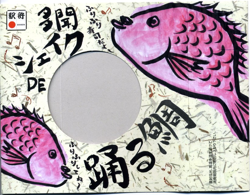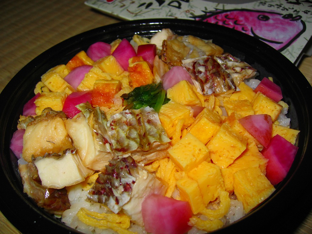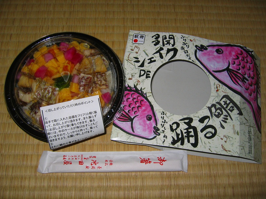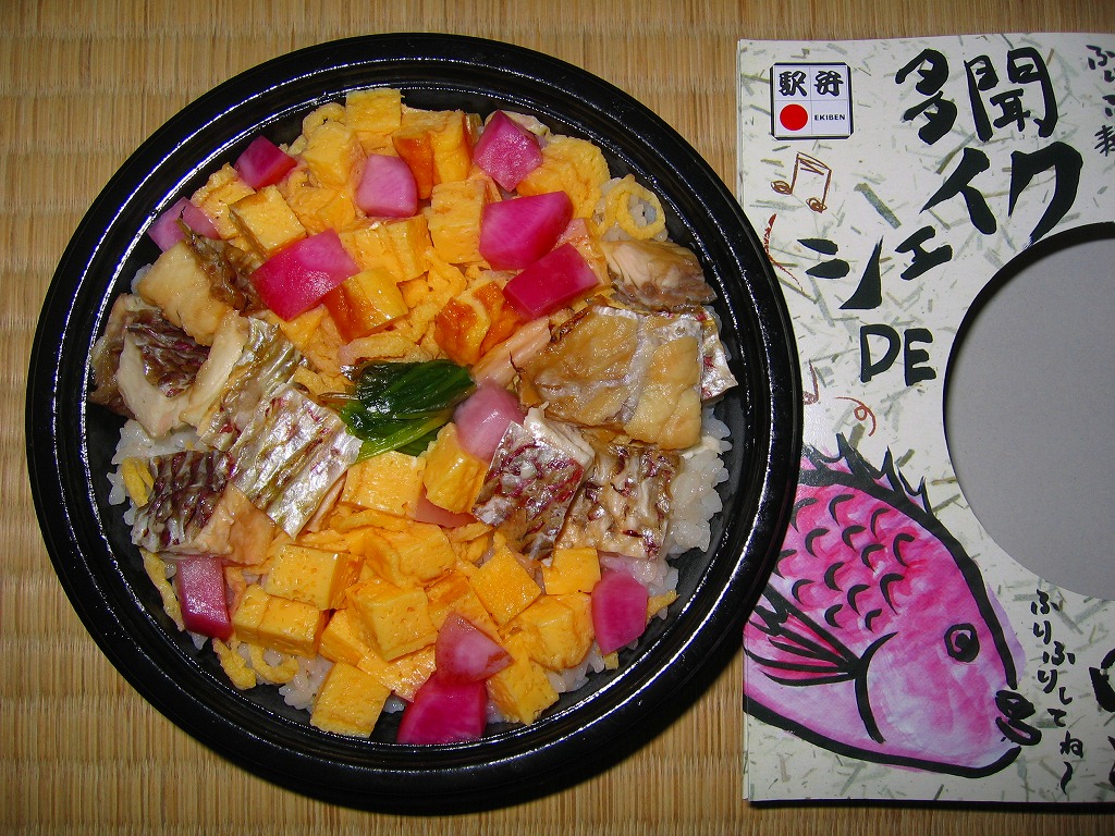 2006(平成18)年12月に発売。ふたが透明なプラ製円形の容器を、奇妙な絵柄を描いたボール紙の枠にはめる。中身は酢飯の上にサイコロ状の玉子焼、鯛の焼き付け、赤かぶ漬を盛り上げるもの。ここまででも駅弁で見た記憶がない鯛丼であり、さらに未開封状態で容器を振れという指示があることも珍しい。
