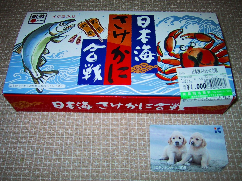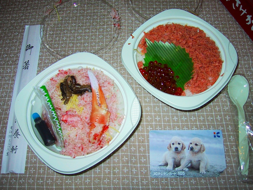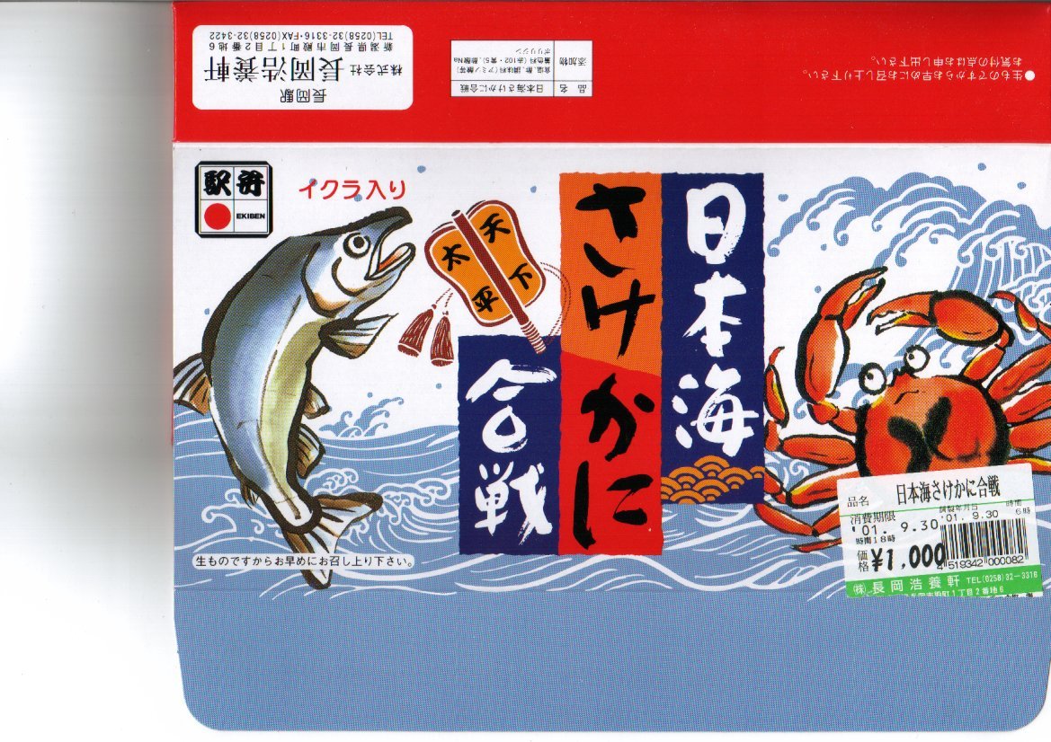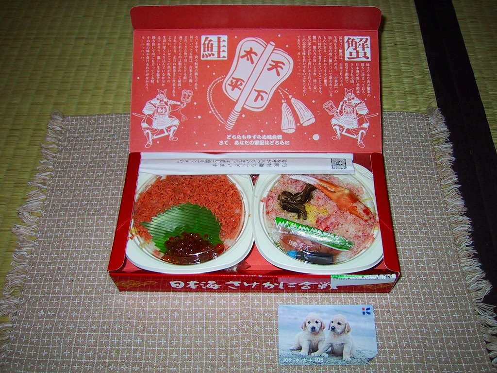 素材は駅弁としてはありふれているが、ストーリー性を持ったユニークな駅弁。やや大きなボール紙製の長方形の容器の中に、鮭いくら丼とカニ丼のふたつの容器が収納されている。味は駅弁らしく、カニがかなり酸っぱく、鮭フレークは市販品並み、いくらは粒がしっかりしておいしい。裏蓋に鮭軍とカニ軍を見立てた読み物があり、食べた人に軍配を預けている。私は鮭に軍配を。しかしこの駅弁は、2009年6月の調製元の事業停止により失われた。