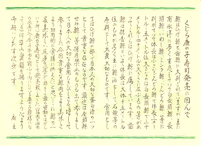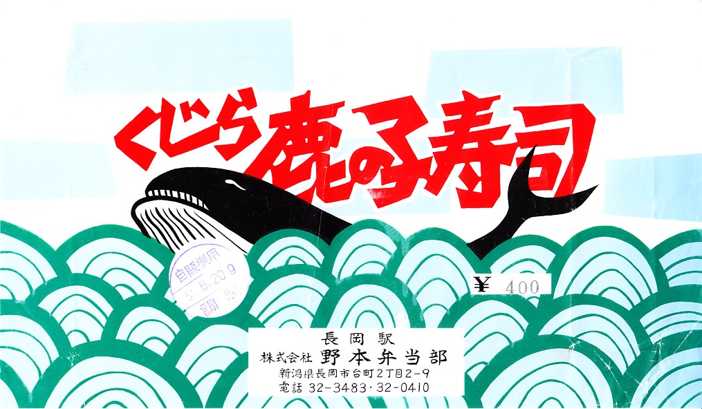 1976(昭和51)年6月20日の調製と思われる、昔の長岡駅弁の掛紙。今にこんな名前の駅弁があれば、売れ行きはともかくネットニュースやSNSで話題になるに違いない。ありがたいことにしおりが残っており、筋肉と油肉の交互に入り合って牛肉の霜ふり肉に似ている、鯨の尾身「鹿の子」(かのこ)を使った寿司であったことがわかる。