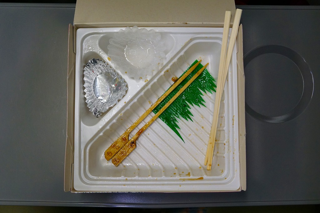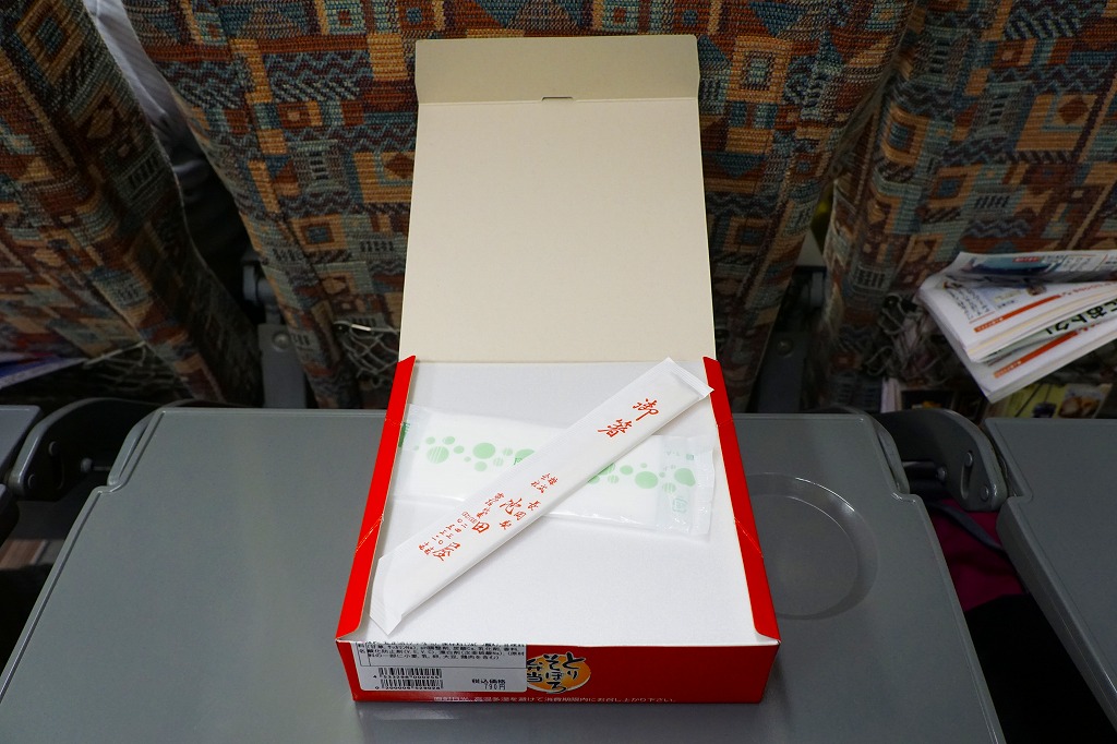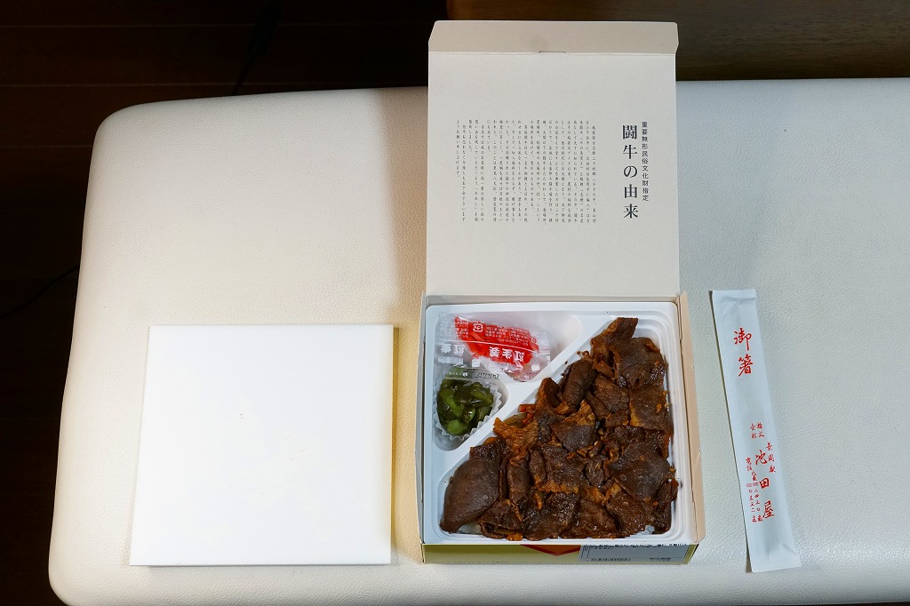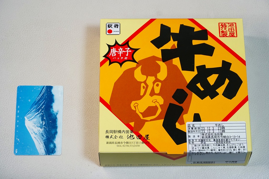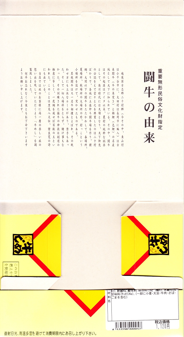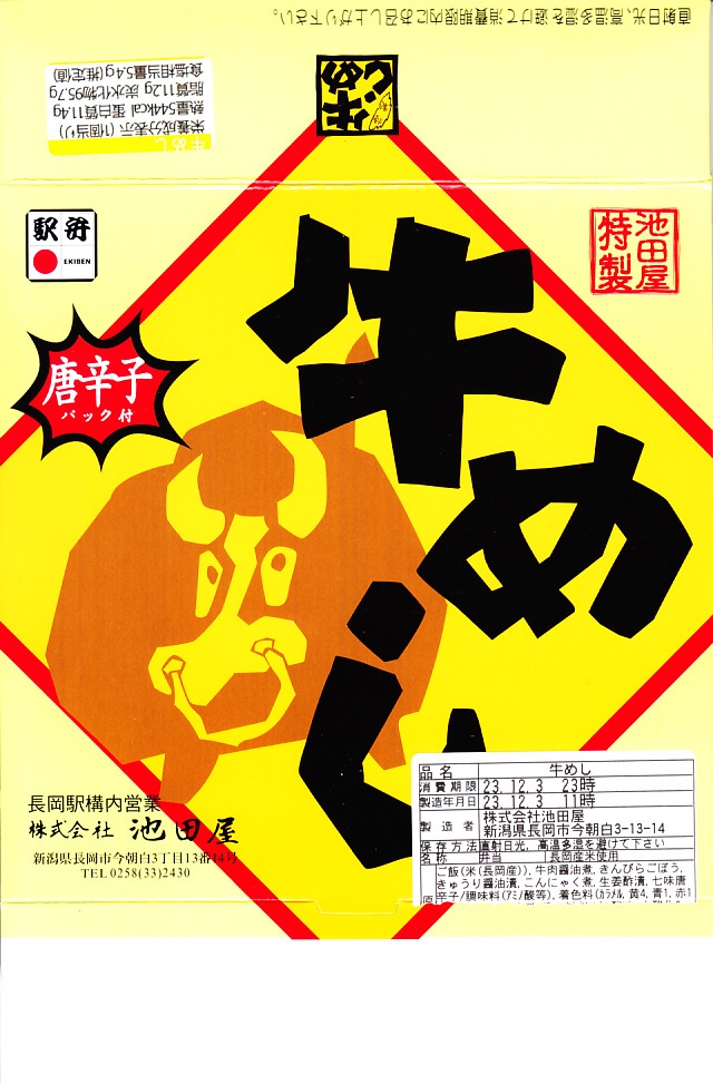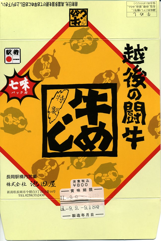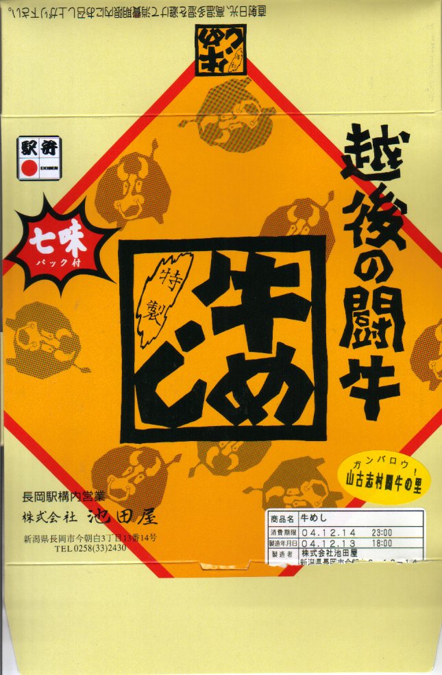 2004(平成16)年に発売か。白いトレーに保温材か緩衝材か発泡スチロールの白いふたをかけて、やや小柄な正方形のパッケージの中に詰めて、食品表示ラベルで留める。駅弁の名前からはいつしか「越後の闘牛」の名が消えたが、ふたの裏では「闘牛の由来」の説明文が健在。