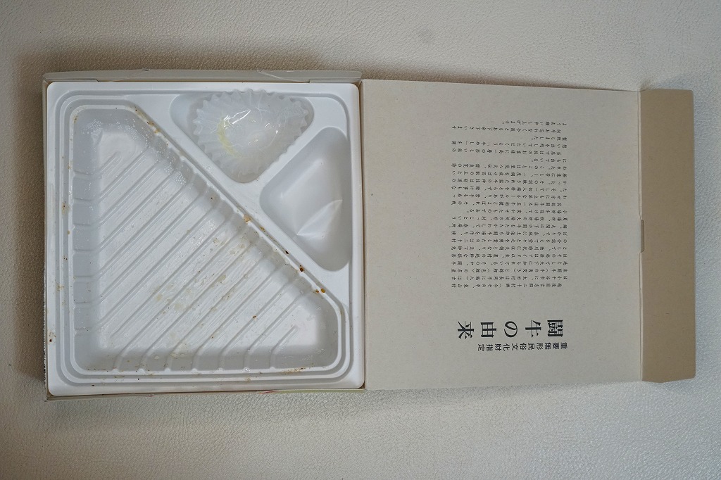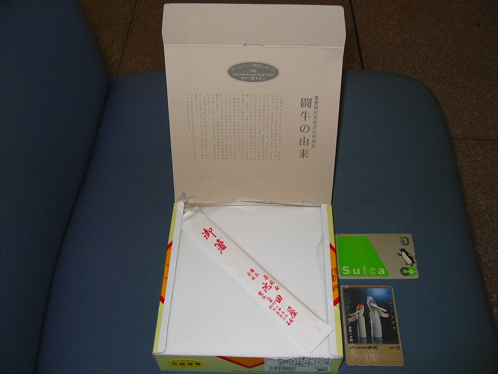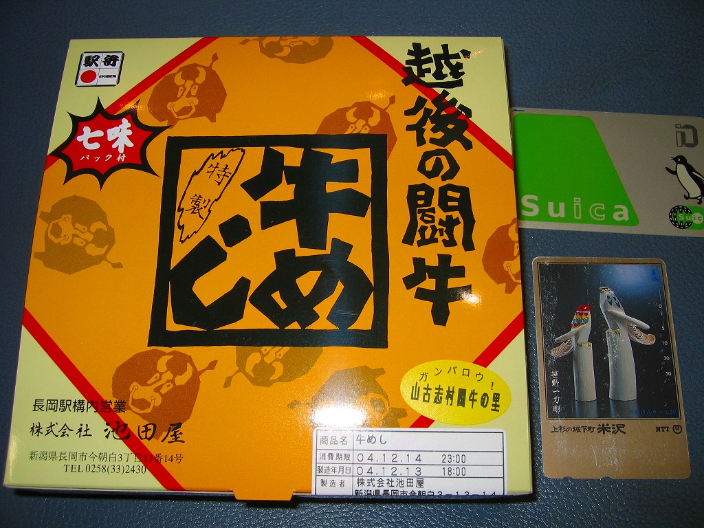 2004(平成16)年12月14日に購入した、長岡駅弁の外箱。「越後の闘牛」表記の有無と、牛の絵柄の大きさを除き、上記の2023年のものと同じ。中身も同じ。駅弁が約20年間変わらない間に、長岡駅では地震が起きる度に駅弁屋が消え、コロナ禍かどうか在来線や改札外での駅弁の販売が消え、新幹線上りホームの駅弁売店のみが残る。