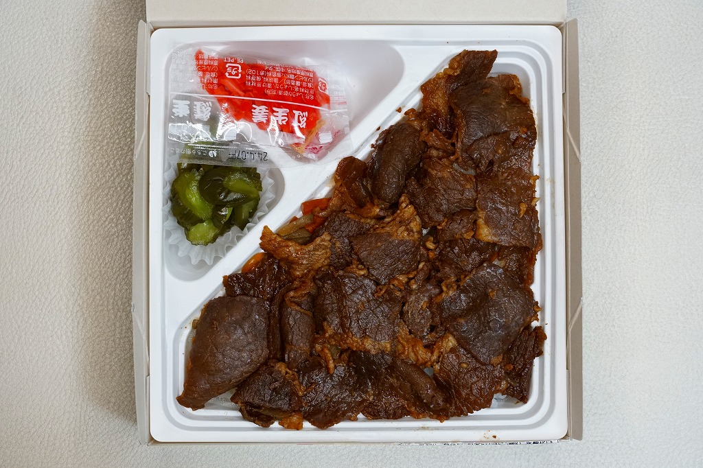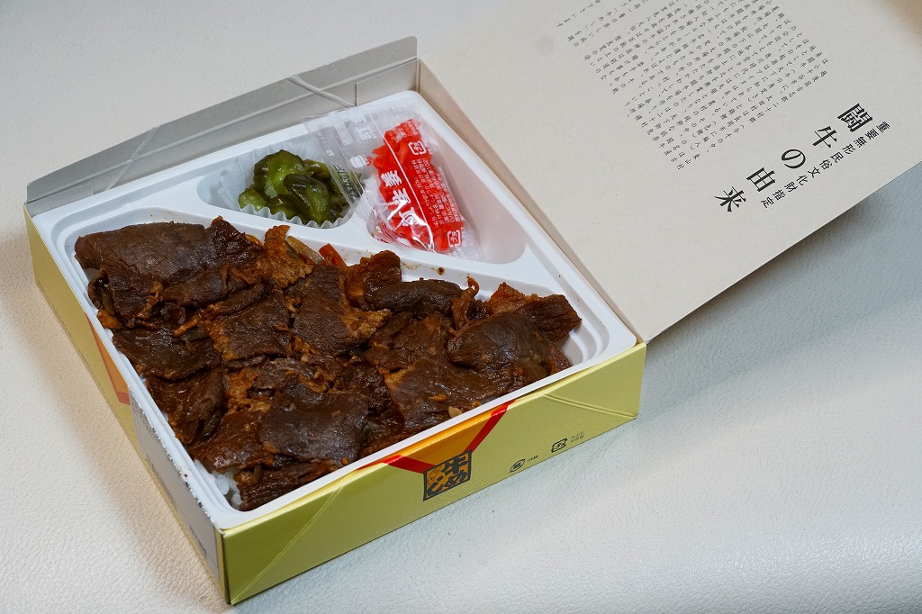中身は白御飯の上に牛肉うま煮を載せる牛めし。濃く赤黒い牛肉は、時雨煮を通り越してビーフジャーキーのような、赤身が固く脂身が筋になるもので、これは特徴なのかどうか。価格は2004年の発売時で800円、2010年時点で840円、2014年時点で890円、2020年時点で990円、2023年時点で1,090円、8月から1,120円。