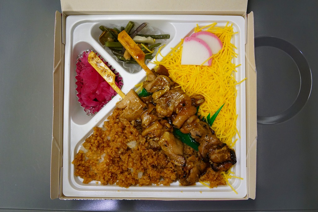 2004(平成16)年8月頃に発売か。白いトレーに保温材か緩衝材か発泡スチロールの白いふたをかけて、やや小柄な正方形のパッケージの中に詰めて食品表示ラベルで封をする。中身は白御飯の上錦糸卵と粒子が細かい鳥そぼろを載せて、その間に炭火焼き鳥を2本置いて、かまぼこで彩る。業務用冷凍食品丸出しな中身だと感じるが、焼き鳥をそのまま串で入れる駅弁は希少だと思うので、「焼き鳥&そぼろ弁当」と呼べば、もう少しは振り返られるかもしれない。価格は2010年時点で750円、2014年時点で790円、2020年時点で890円、2022年時点で販売休止中。