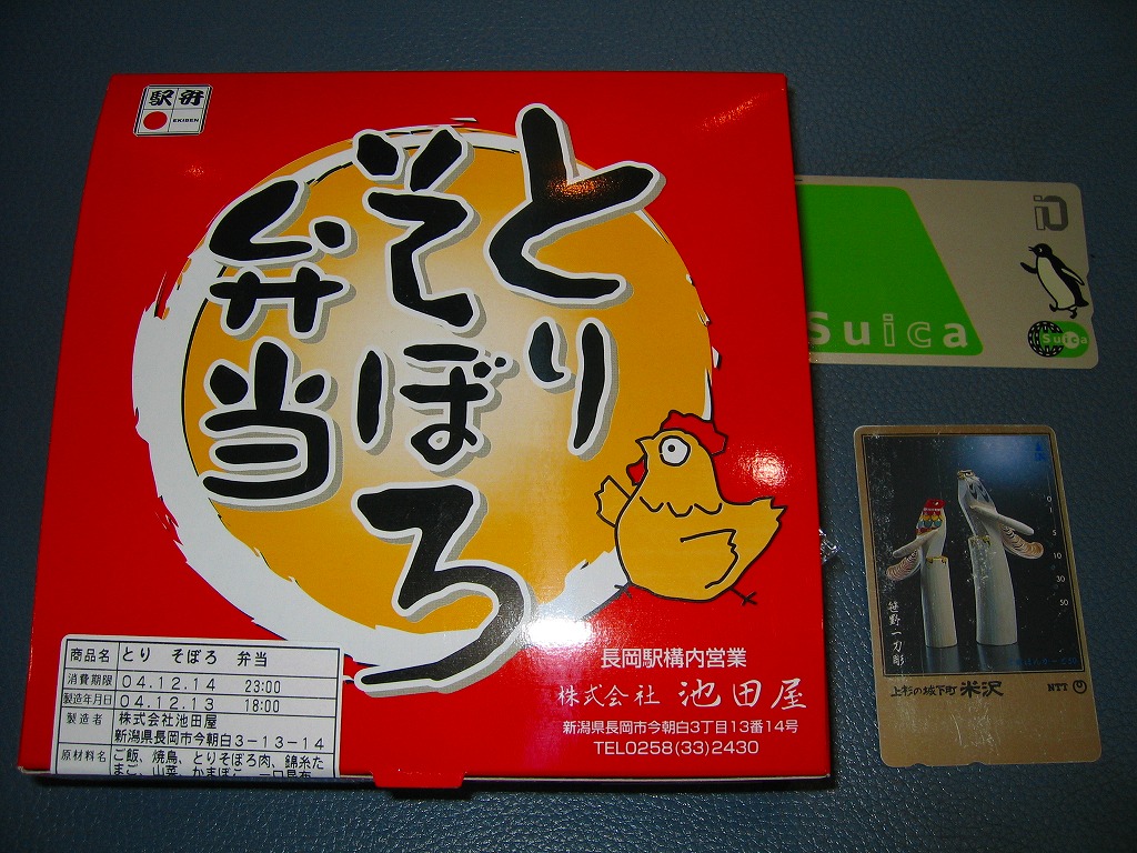 2004(平成16)年12月14日に購入した、長岡駅弁のパッケージ。上記の10年後と、容器も中身もまったく同じ。2か月前に起きた大地震を受けた、復興支援目的の百貨店催事で購入した。輸送の影響か災害の影響か、新潟県の駅弁にしては御飯がうまくなかった。