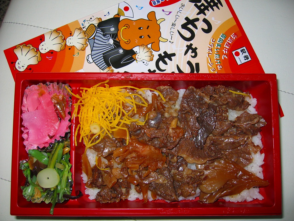 2007(平成19)年の夏頃に発売か。つまり下で紹介する「もぉ〜舞ちゃう」の非加熱機能付き容器版で、長方形のトレー接着容器に同じ中身が入っている。今回は甘すぎるが冷たくても柔らかくうまみがある牛細切の風味が個性的。この駅弁は、2009年6月の調製元の事業停止により失われた。