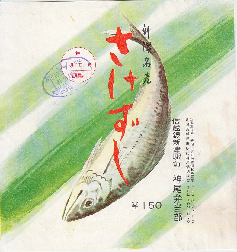 1966(昭和41)年2月16日(水)の調製と思われる、昔の新津駅弁の掛紙。笹の色と鮭の姿を描いたようにみえる。調製印は京王百貨店のものであり、今に続く全国最大級の駅弁大会「有名駅弁と全国うまいもの大会」の第1回で実演販売されたものだろう。歴史を語る貴重なものだと思う。