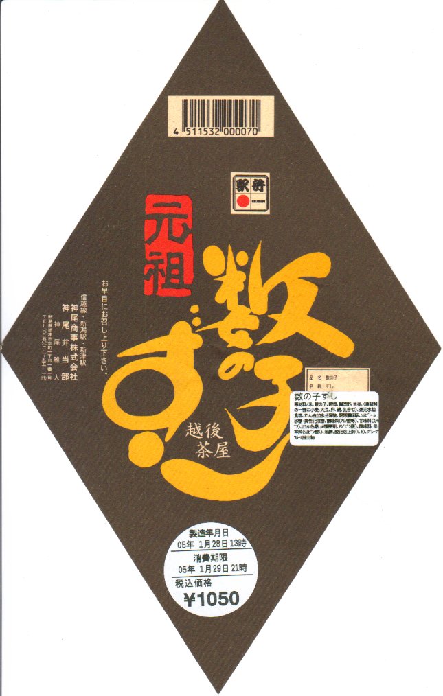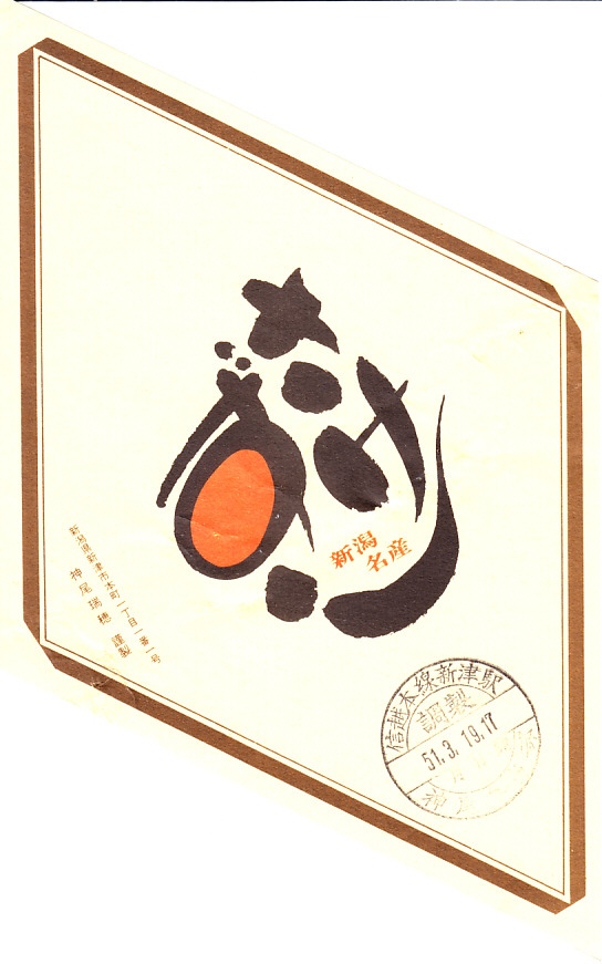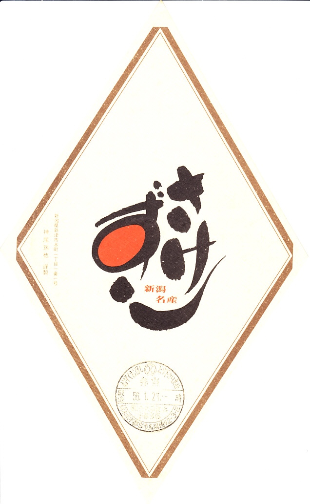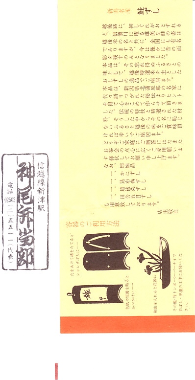 1981(昭和56)年1月27日の調製と思われる、昔の新津駅弁の掛紙。調製印から栃木県宇都宮市の西武百貨店宇都宮店で売られたことがわかる。上記の現行のものと同じく、文字と枠だけのシンプルな絵柄。当時は法定の食品表示がなく、文字が掛紙の真ん中に置かれた。