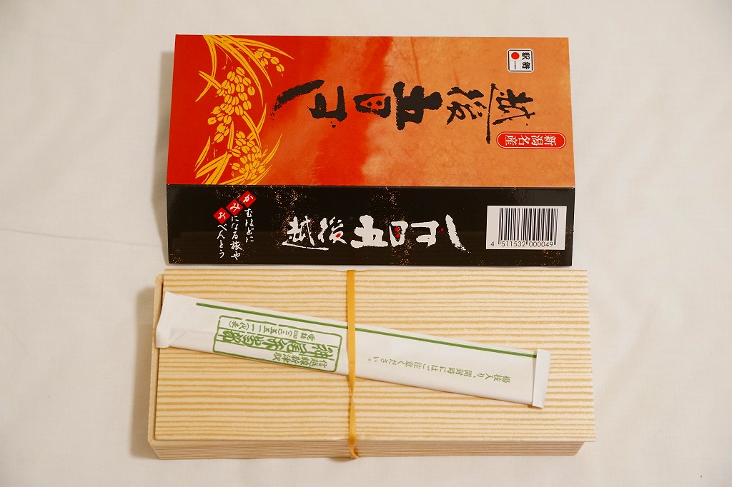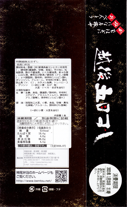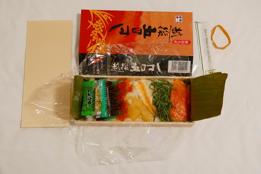 上記の駅弁「越後五目ずし」の上等版か。笹を敷いた酢飯に並べて覆う具が、順に紅鮭、山せり、えび、カズノコ、イクラ、きゃらぶきであり、カズノコが追加されている。容器が割竹型でなく長方形で、これを掛紙でなくスリーブに収める、見た目はまったくの別物で、味はそっくり。価格は2021年の購入時で1,080円、2022年9月から1,180円。