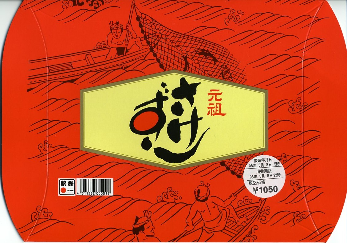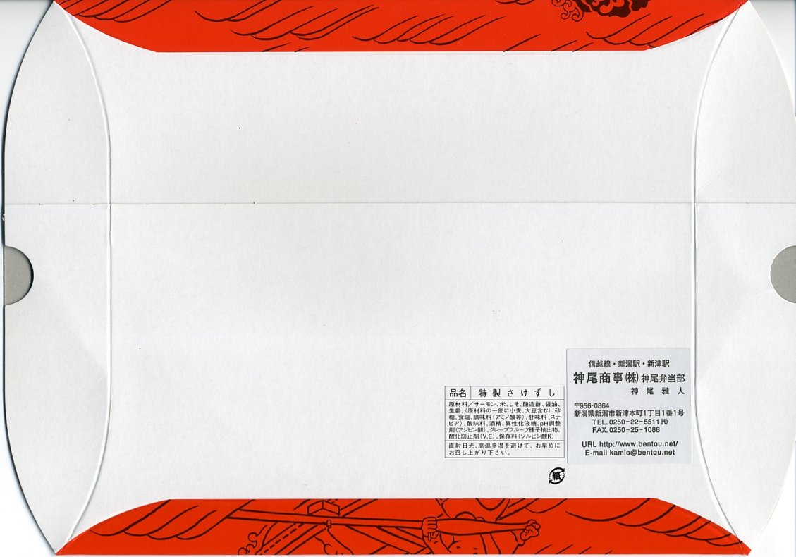 調製元の公式サイトによると昔から好評の駅弁らしく、朝の時間帯で駅弁の種類がとても少なかった新潟駅でもちゃんと取り扱いがあった。パッケージで鮭色に染まる柄は、新潟県村上市を流れる三面川の伝統漁法「居繰網漁」だろうか。今も10月中旬から12月初旬にかけて見学できる。価格は2005年の購入時で1,050円、2015年時点で「特製さけずし」1,250円になっている。2020年までの販売か。