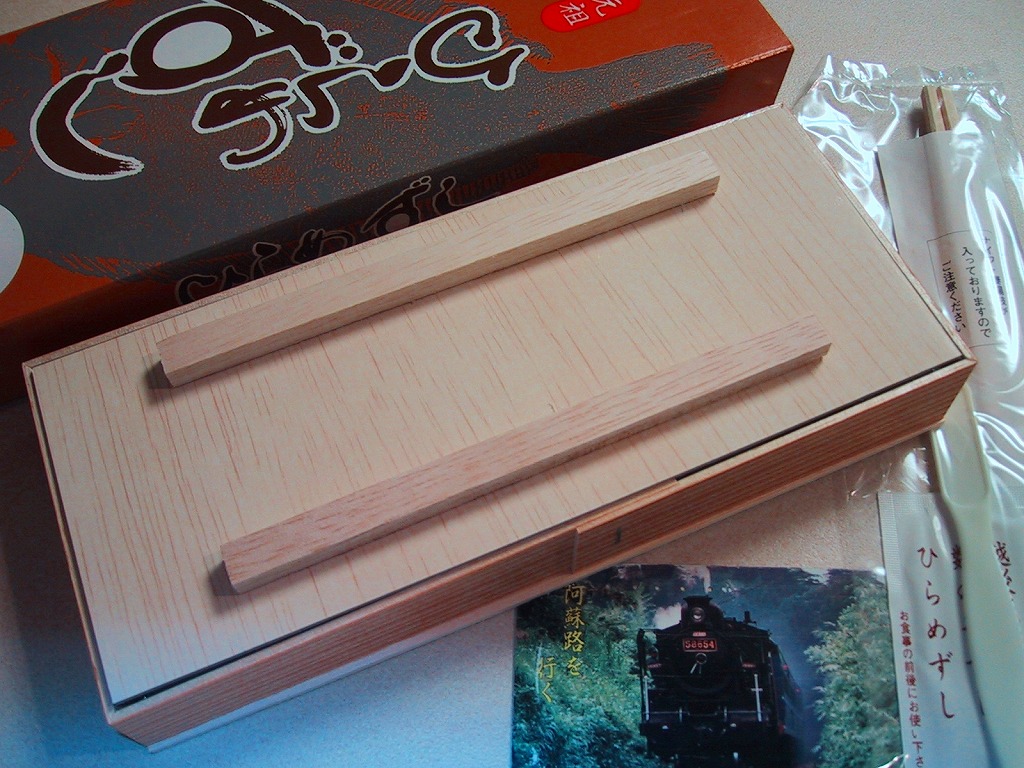 割竹を模したプラスティック製容器を使う。ラップを敷いた上に酢飯を敷いて、その上にサーモン・山みつば・海老・イクラ・フキを載せたちらしずし。割り箸とともにプラスティックのナイフが付属するが、必要はなさそう。県内で余った孟宗竹の有効利用を森林組合から要請されて誕生した駅弁だそうで、過去には本物の竹が容器として使われていたとか。御飯と鮭が美味かった。価格は2002年の購入時で870円、2015年時点で930円、2022年9月から1,000円。