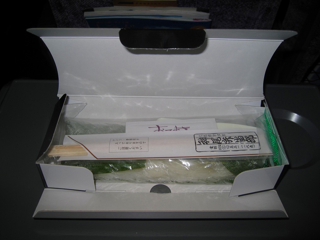 全国で唯一のヒラメ駅弁だとか。経木とボール紙でできた強度のある長方形の容器を、ボール紙のパッケージに収納する。中身は酢飯の上に塩と酢で締めた透き通るような白さの平目、正確には北太平洋産のハリバット(大ひらめ)を敷いている。