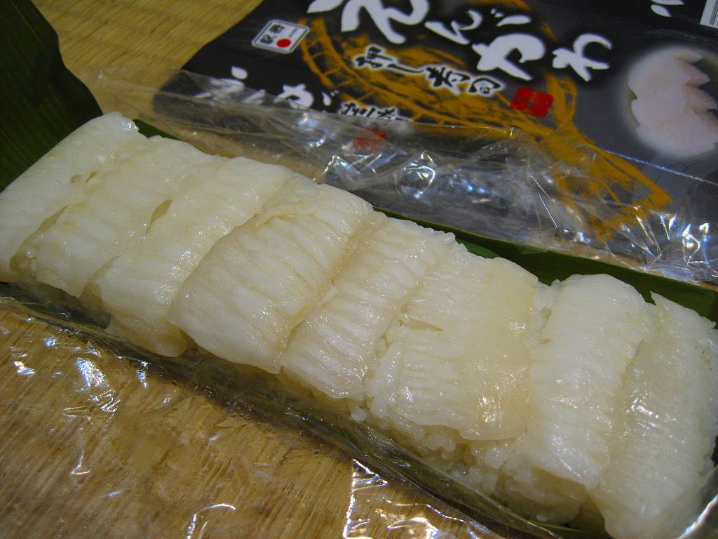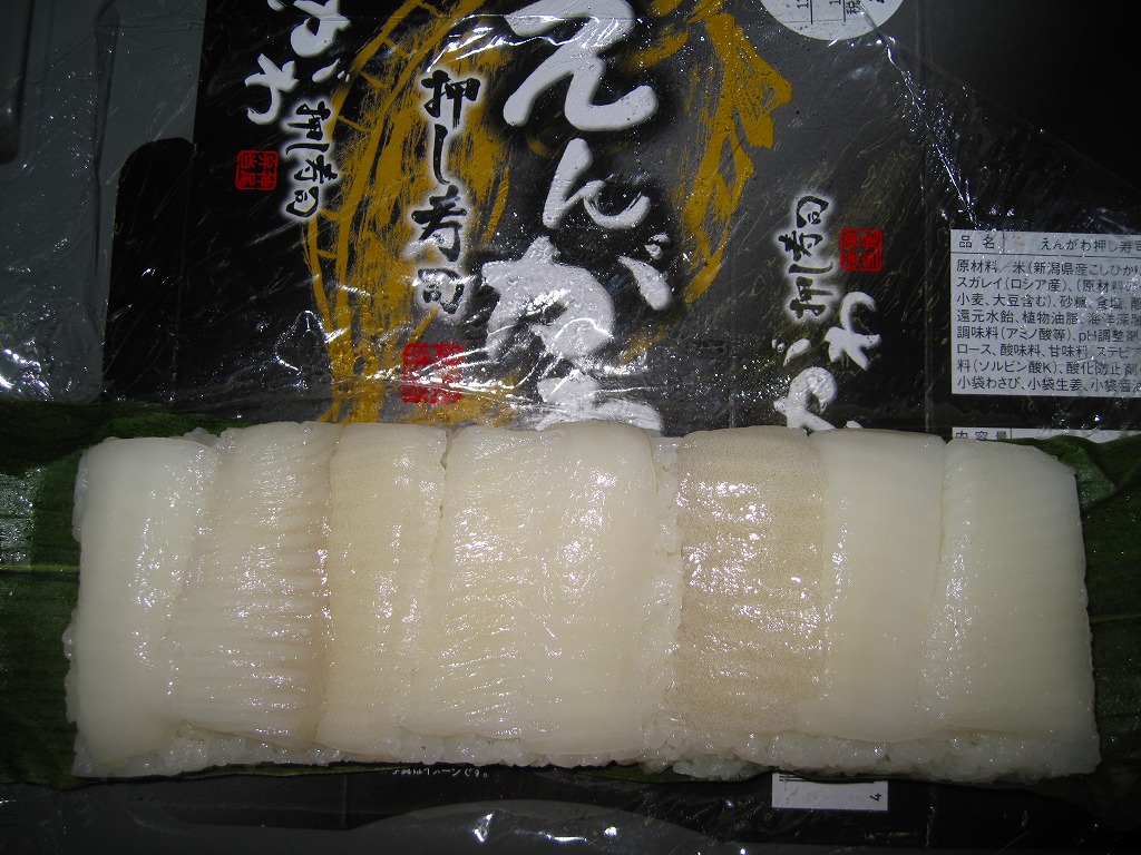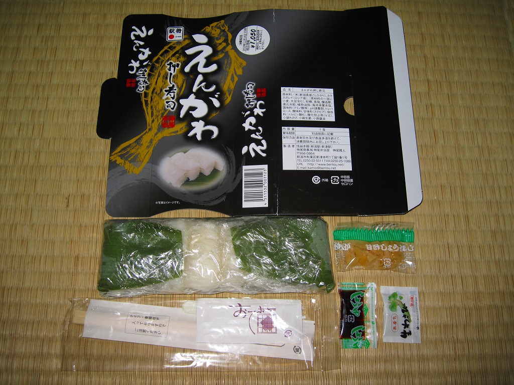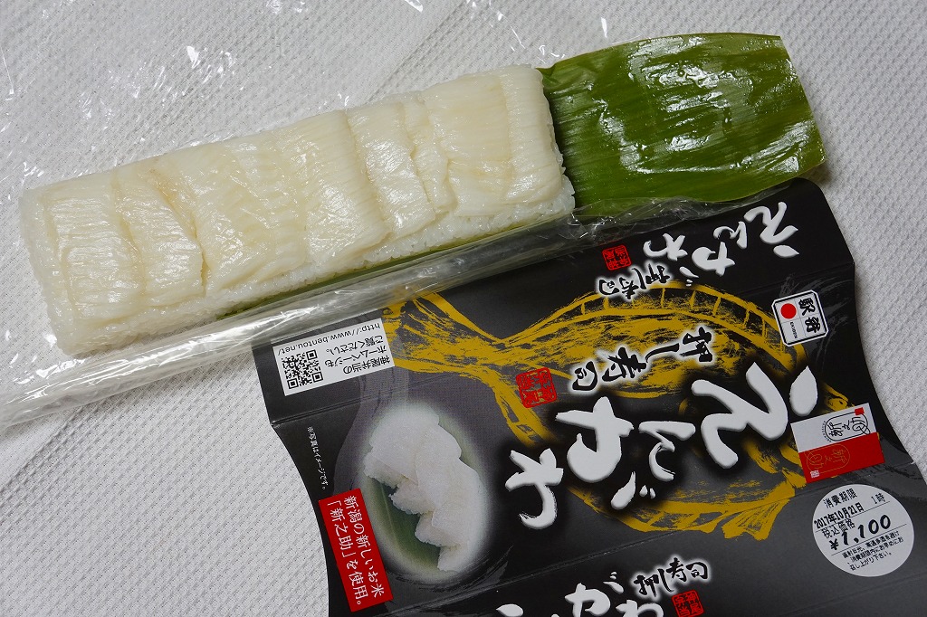 2010(平成22)年秋の新商品として、10月までに発売。カラスガレイの真っ白なえんがわを新潟県産コシヒカリの酢飯に合わせた押寿司を1本、笹の葉に包み、透明なビニールシートで巻き、甘酢生姜と醤油とわさびを添付し、中身のイメージ写真とカレイのイラストを印刷したボール紙の箱に詰める。これはきっと、2007(平成19)年12月限りで「しばらく遠い旅に出て」しまった「元祖ひらめずし」の生まれ変わりではないかと思う。脂がジューシーで、白さがまぶしく、飯と具のとろけ具合がたまらない。