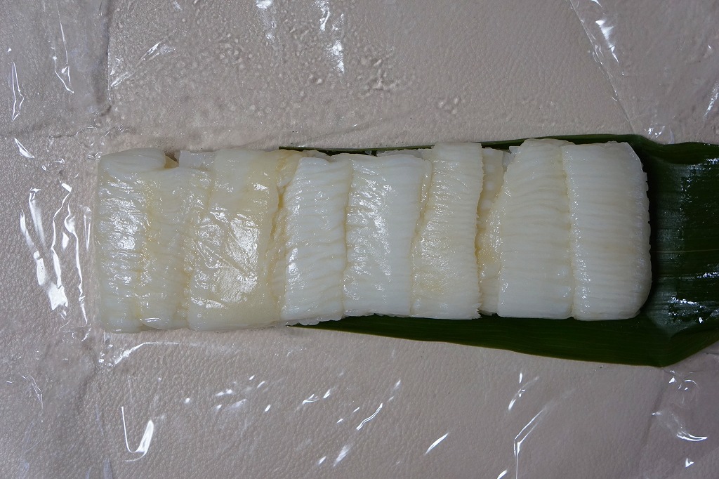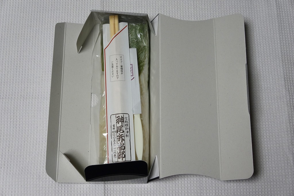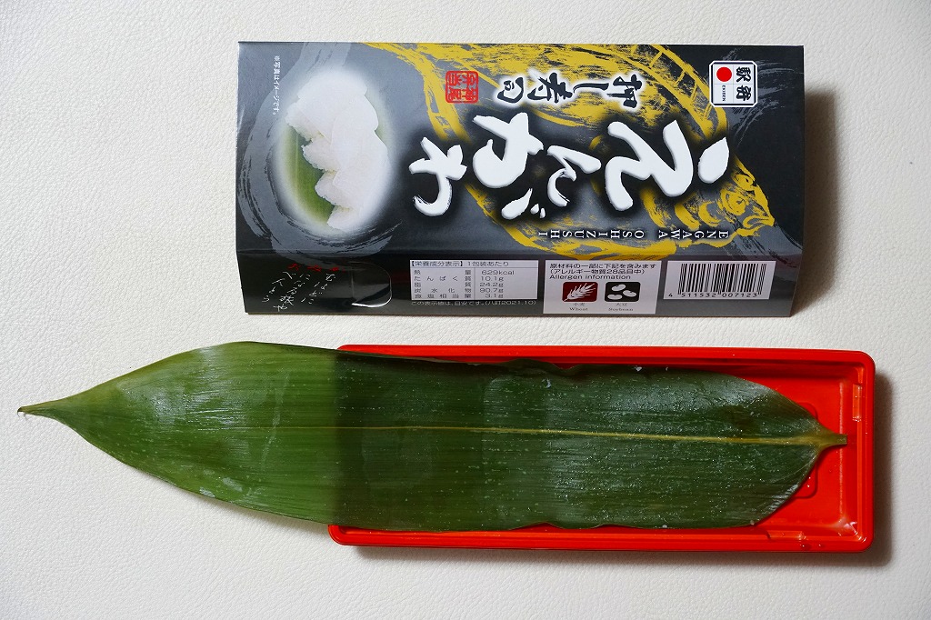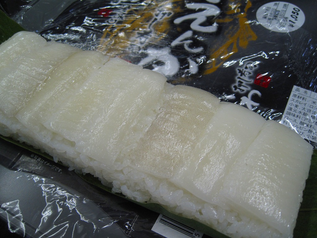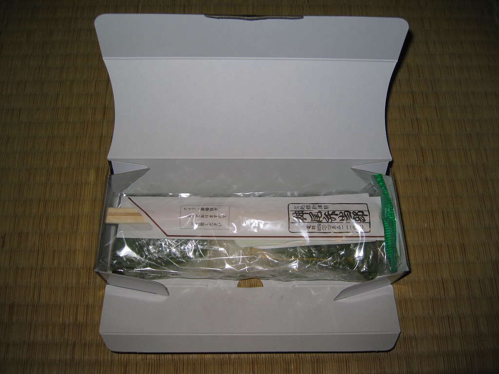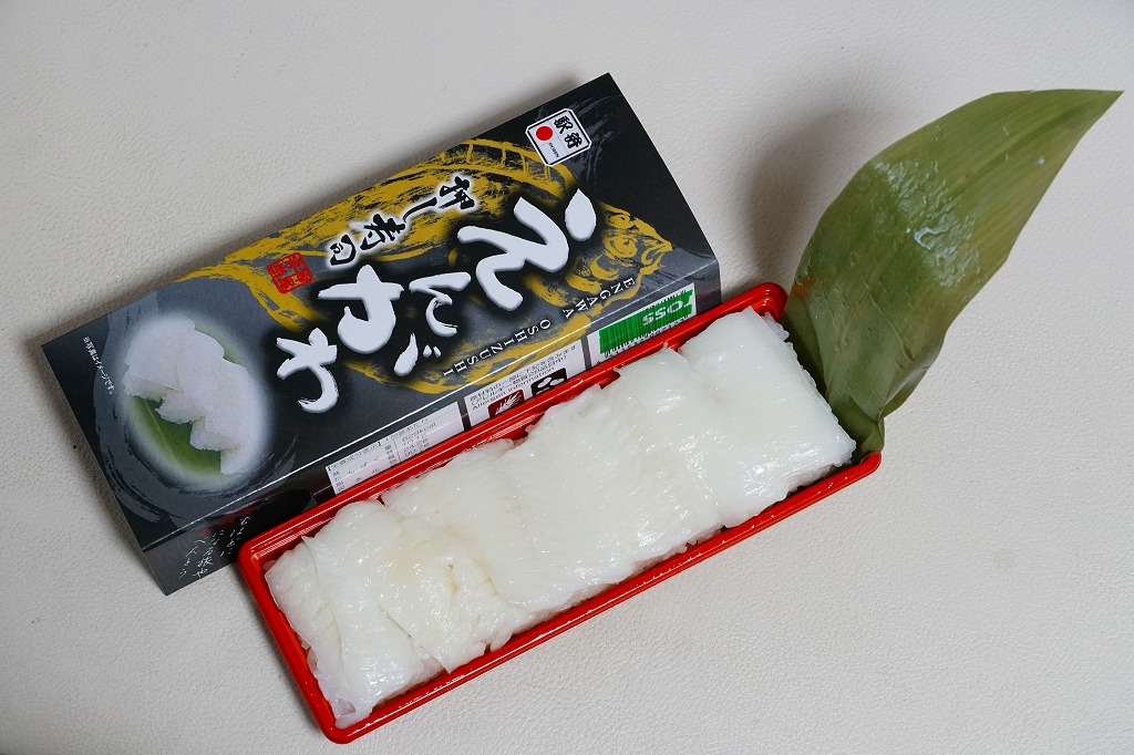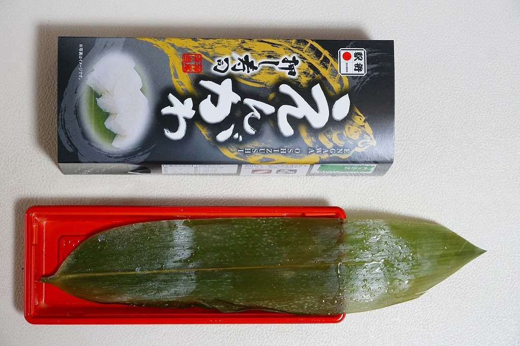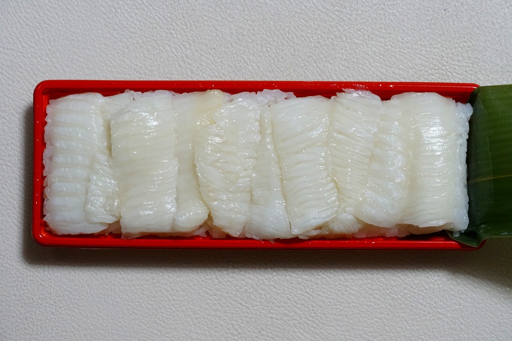 昔は本物の竹を使ったという、竹を縦に割った形状のプラスティック製容器を使用、そこに笹の葉を敷き、コシヒカリ使用のすし飯の上にたっぷりとカズノコ醤油漬が載る。その間に挟まる鰹節の効果か、カズノコも酢飯も本当にふんわりした感じが出ている。紅生姜と醤油が袋で付くが、かける前に一口はそのままでいただきたい。