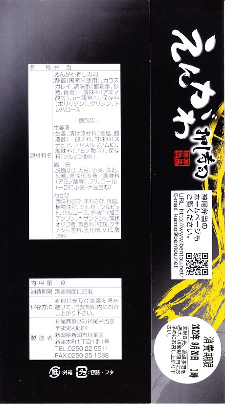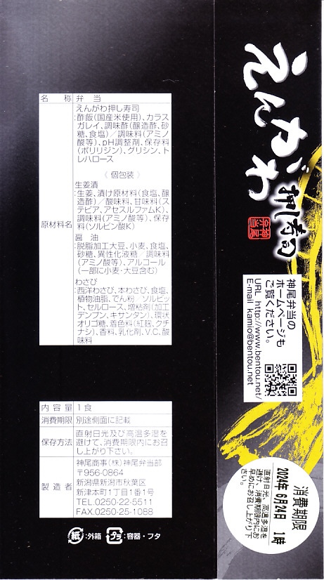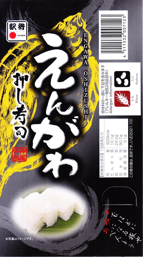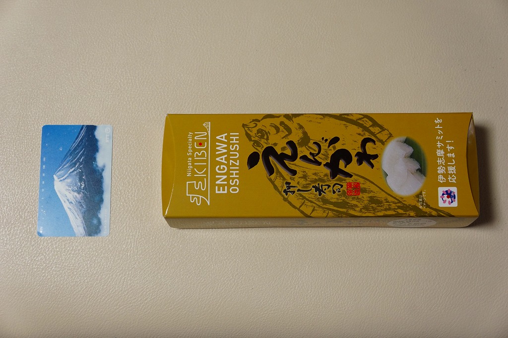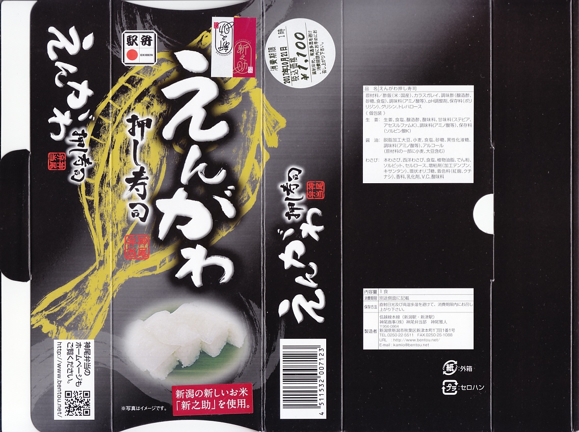 2017(平成29)年10月20日に購入した、新津駅弁のパッケージ。上記の駅弁「えんがわ押し寿司」の米を、2017(平成29)年の秋に本格デビューした新潟県一押しの新品種「新之助」に、同年9月から置き換えて販売した。加えて同年秋のJR東日本の駅弁キャンペーン「駅弁味の陣2017」にエントリー。