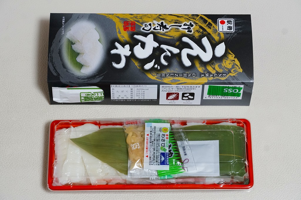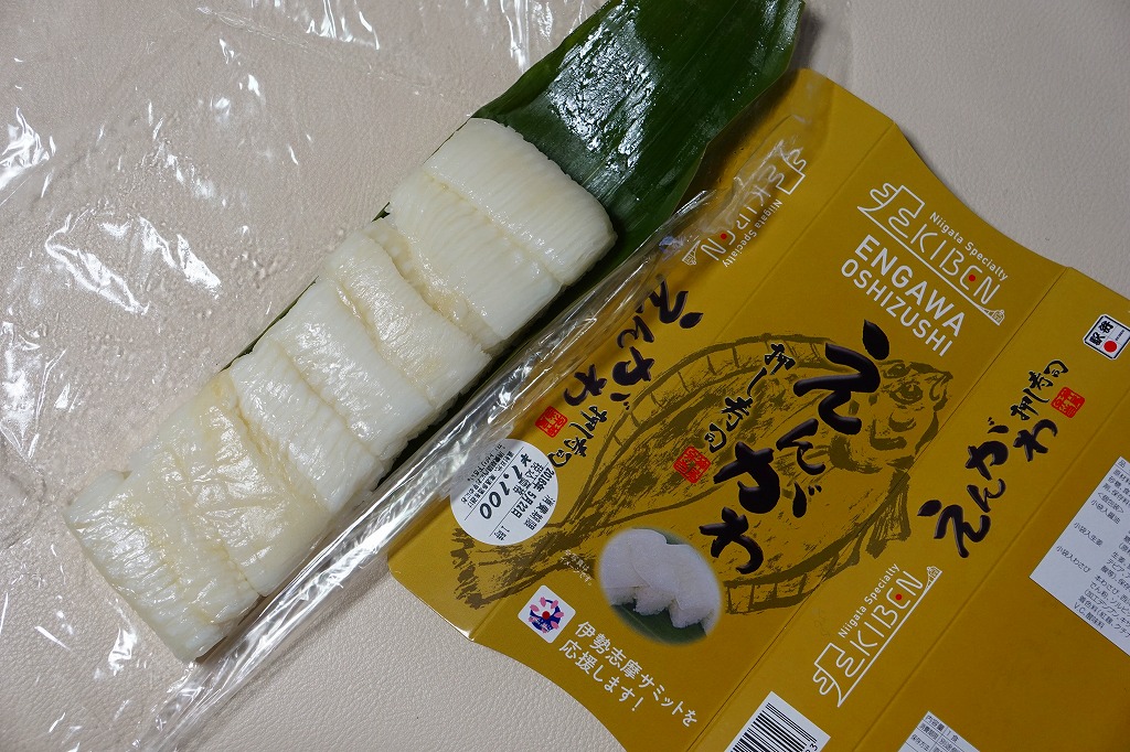 上記の駅弁「えんがわ押し寿司」の、2023(令和5)年時点での姿。上記の2024年のものと変わらない。