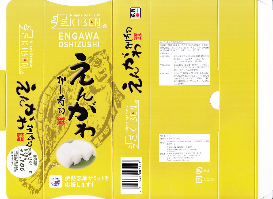 2016(平成28)年5月21日に購入した、新津駅弁のパッケージ。伊勢志摩サミットの開催を記念して、仙台駅から小倉駅まで11種類の駅弁について、パッケージに駅弁の名前の英文表記とほぼ共通のロゴマークを印刷し、東京駅の駅弁売店で販売した。価格と中身は通常版と同じ。