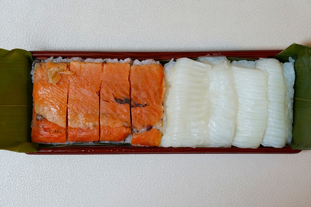 この形では他に見ない鮭押寿司駅弁。八角形の押寿司容器を紅鮭色のボール紙製パッケージに詰める。笹の葉とラップに包まれた中身は、シソを混ぜたコシヒカリの酢飯の上に紅鮭を載せて押した押寿司。同じタイプで著名な富山のますのすしと比べて、鮭と飯の風味のやわらかさが物足りなく、なるほどこれで他地域に広がっていないだろうか。