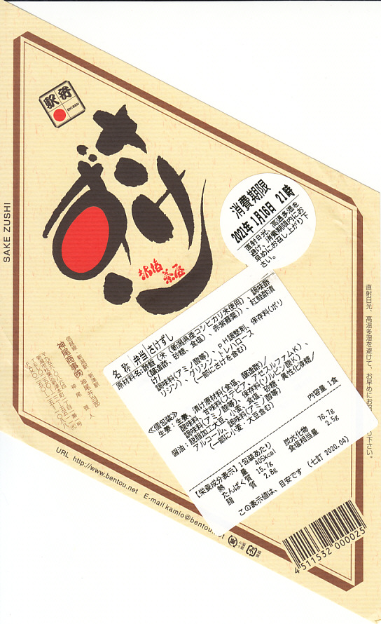 2010(平成22)年11月14日に購入した、新津駅弁のパッケージ。上記の2011年のものと、まったく同じ。上記の現地版と、この催事版で、消費期限シールの表記が異なる。
