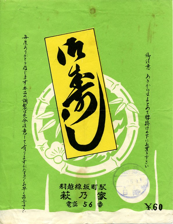 昭和30年代頃の調製と思われる、昔の坂町駅弁の掛紙。羽越本線と米坂線の接続駅である坂町では、昭和50年代頃まで幕の内と寿司の普通弁当が細々と売られていたそうだが、今はなくなっている。