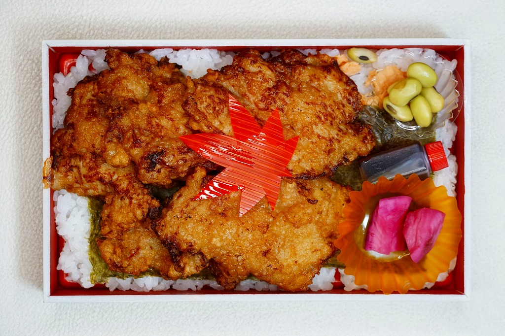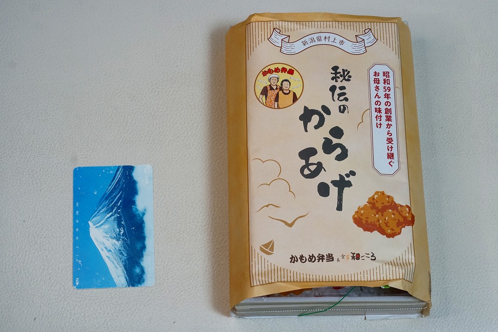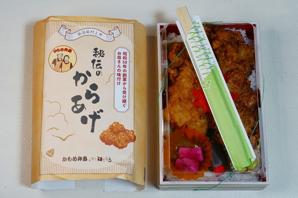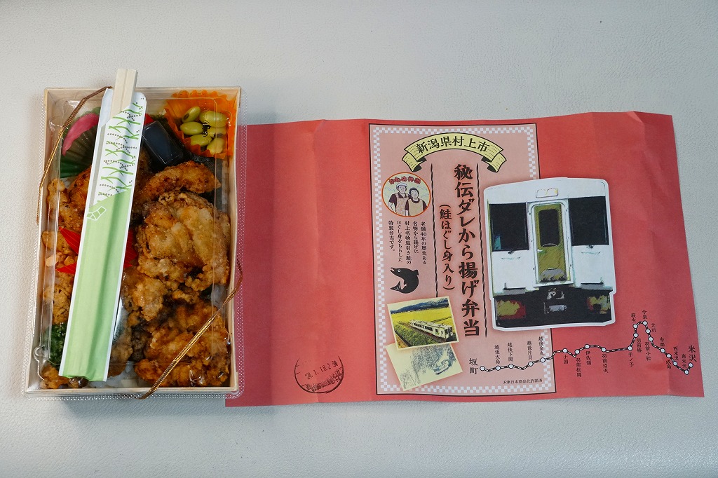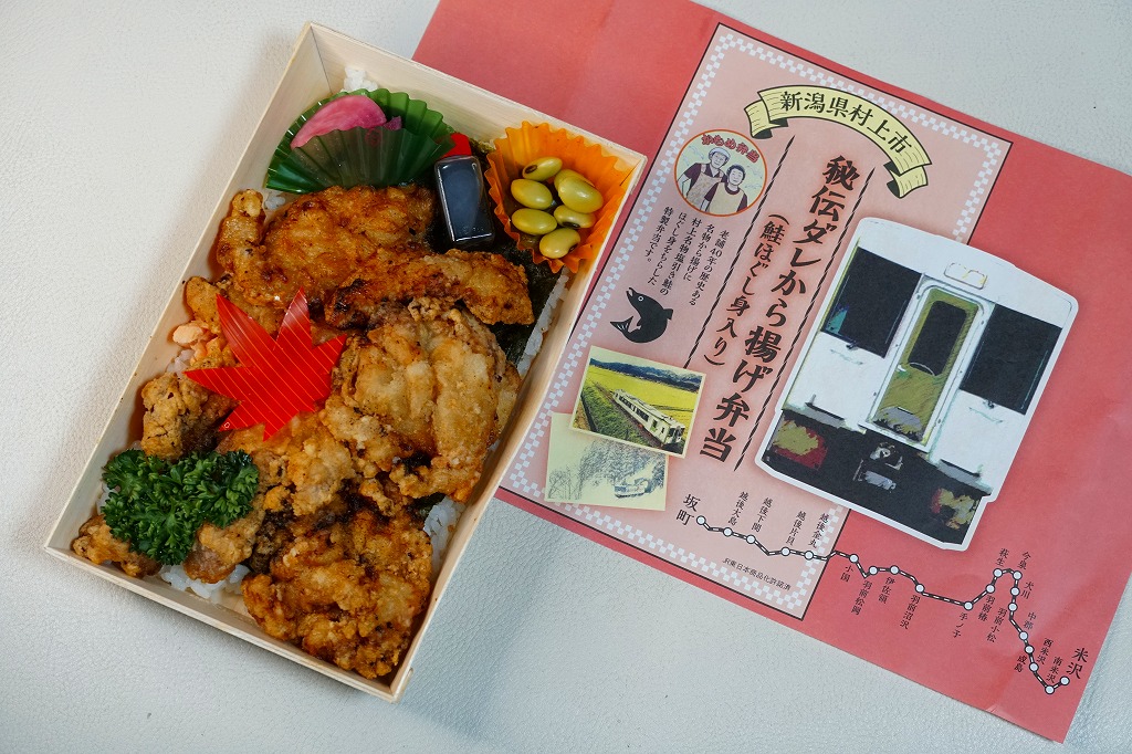 長方形の木質エコ容器に白飯を敷き、海苔を貼り、たっぷりの鶏唐揚で覆い、鮭ほぐし身を少し詰め、煮豆と漬物とたれを添える。日本全国のスーパーや惣菜・弁当店でおなじみの唐揚げ弁当を、元気にした感じ。実演販売ブースで配布したチラシによると、坂町駅から20kmくらい北で日本海に面した、羽越本線の線路と国道345号に沿う弁当店で、のりからあげ弁当(600円)を販売するという。