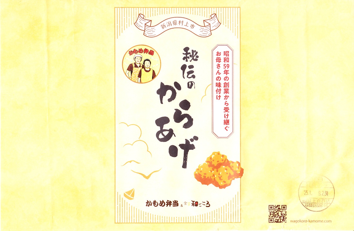 2025(令和6)年1月の京王百貨店の駅弁大会で、JR米坂線の坂町駅の駅弁として実演販売。大会での商品名は「秘伝ダレから揚げ弁当」。長方形の平たいプラ容器に白飯を敷き、海苔を貼り、たっぷりの鶏唐揚で覆い、鮭ほぐし身を少し詰め、煮豆と漬物とたれを添える。つまり前年と同じ。掛紙の絵柄を変え、「昭和59年の創業から受け継ぐお母さんの味付け」「かもめ弁当」と記し、坂町駅では売られない弁当であり、坂町駅に駅弁はない。他の駅弁催事でも実演販売をしているらしい疑義駅弁。