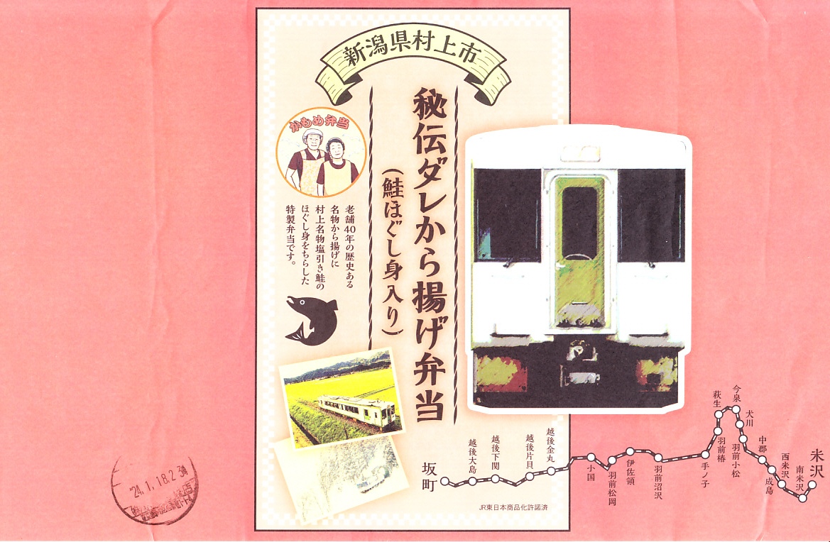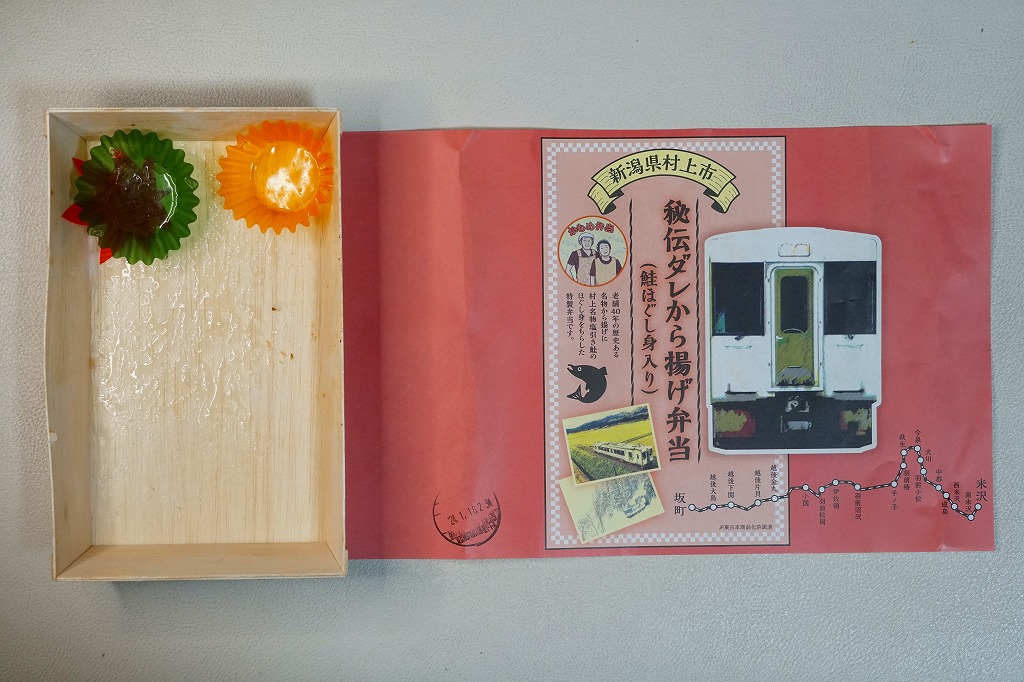 2024(令和6)年1月の京王百貨店の駅弁大会で、JR米坂線の坂町駅の駅弁として実演販売。同催事の「がんばれ!ローカル線」企画で、2022年8月の豪雨で今泉駅から坂町駅までの間で運休し再開の見込みがない、JR米坂線の今泉駅と坂町駅の駅弁を名乗る弁当を、催事場で実演販売した。掛紙には商品名と宣伝文と、JR米坂線の路線図や写真を掲載した。